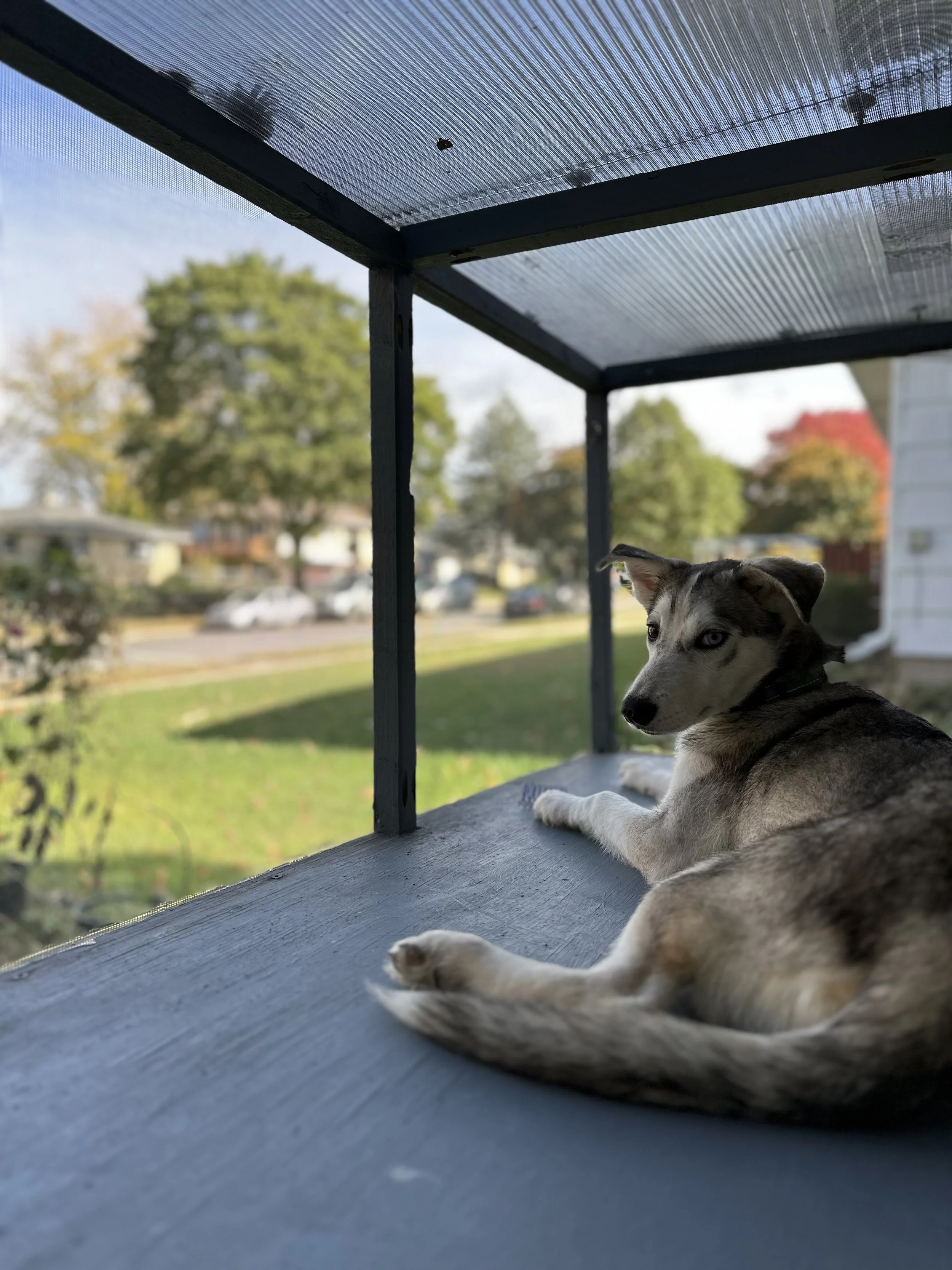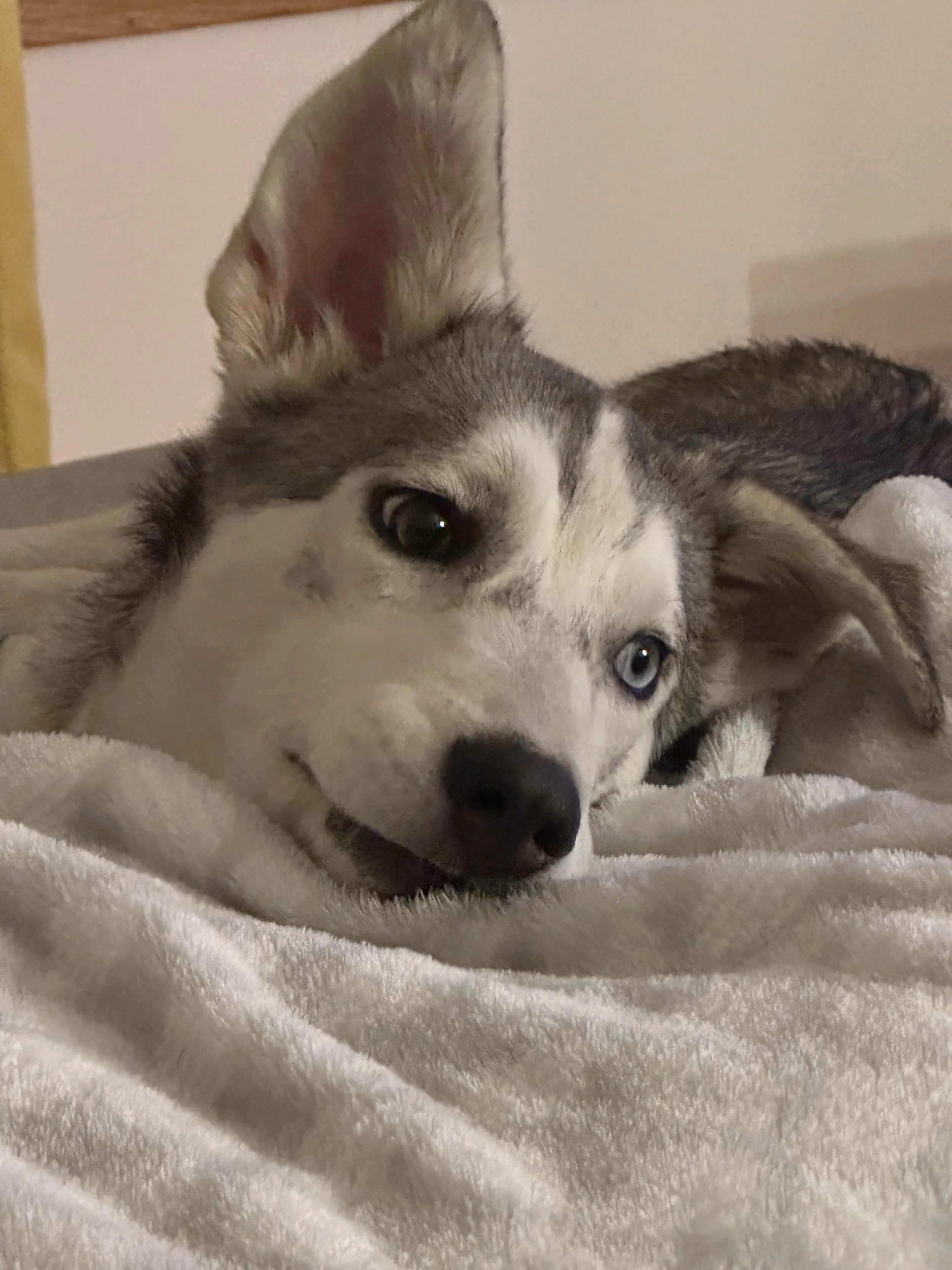 Athena is a gorgeous husky mix with one striking blue eye, the softest fur imaginable, and absolutely zero traction when she runs. It’s is as entertaining as it sounds. Since arriving from Texas, she’s been thriving (and happily putting on some much-needed weight — she’s very compliant about it, thank you).