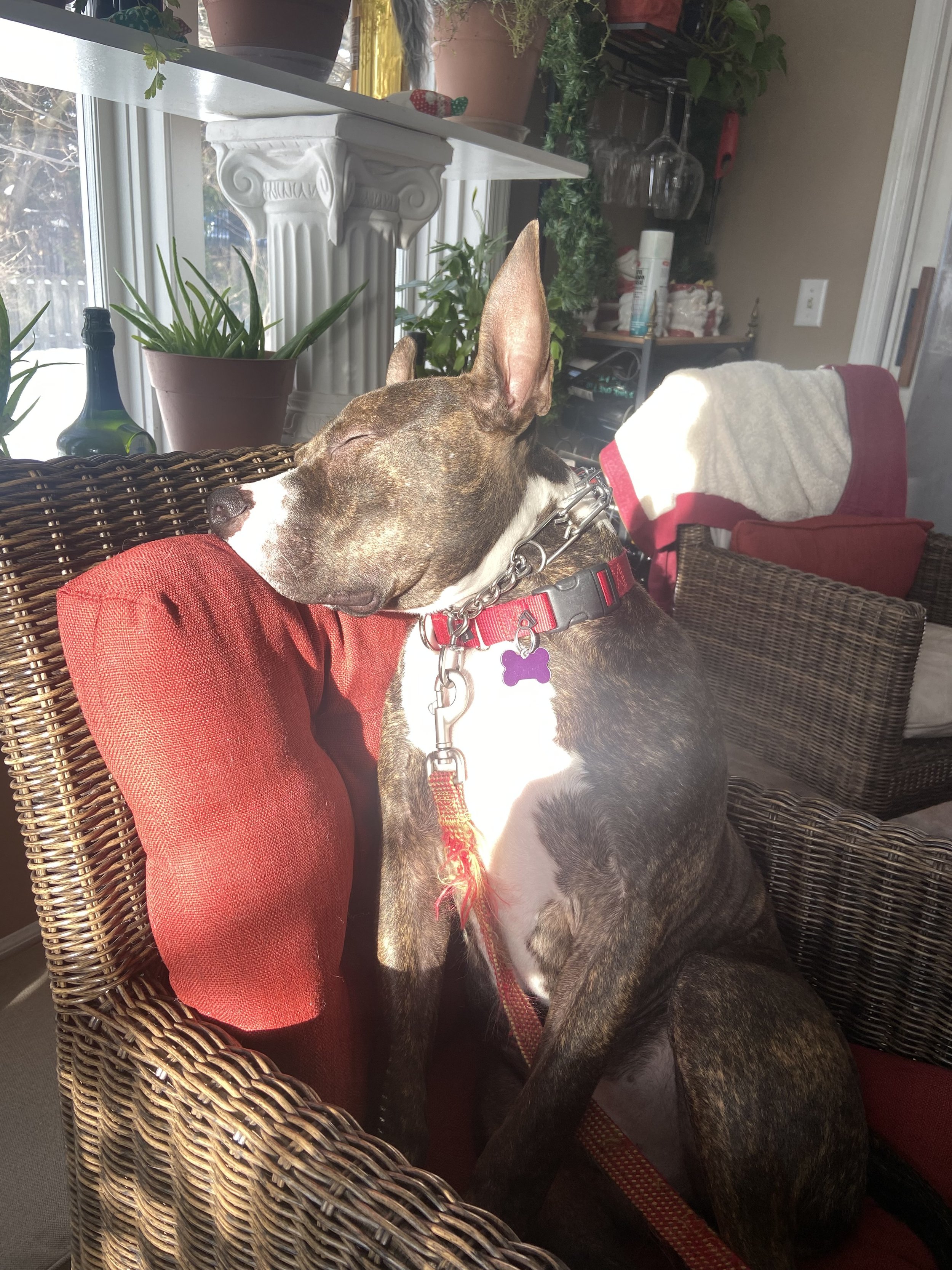 When Braxton gets over excited, "tethering", or putting him on his leash in the house, is helpful to help calm and contain him in a way he can still keep you company. He is a shadow and loves to be with his people. With proper exercise, Braxton settles down in the evening (and for an occasional afternoon nap) and is very happy to snuggle up on the couch. He is a fantastic sleeper at night and prefers to be as close as possible.