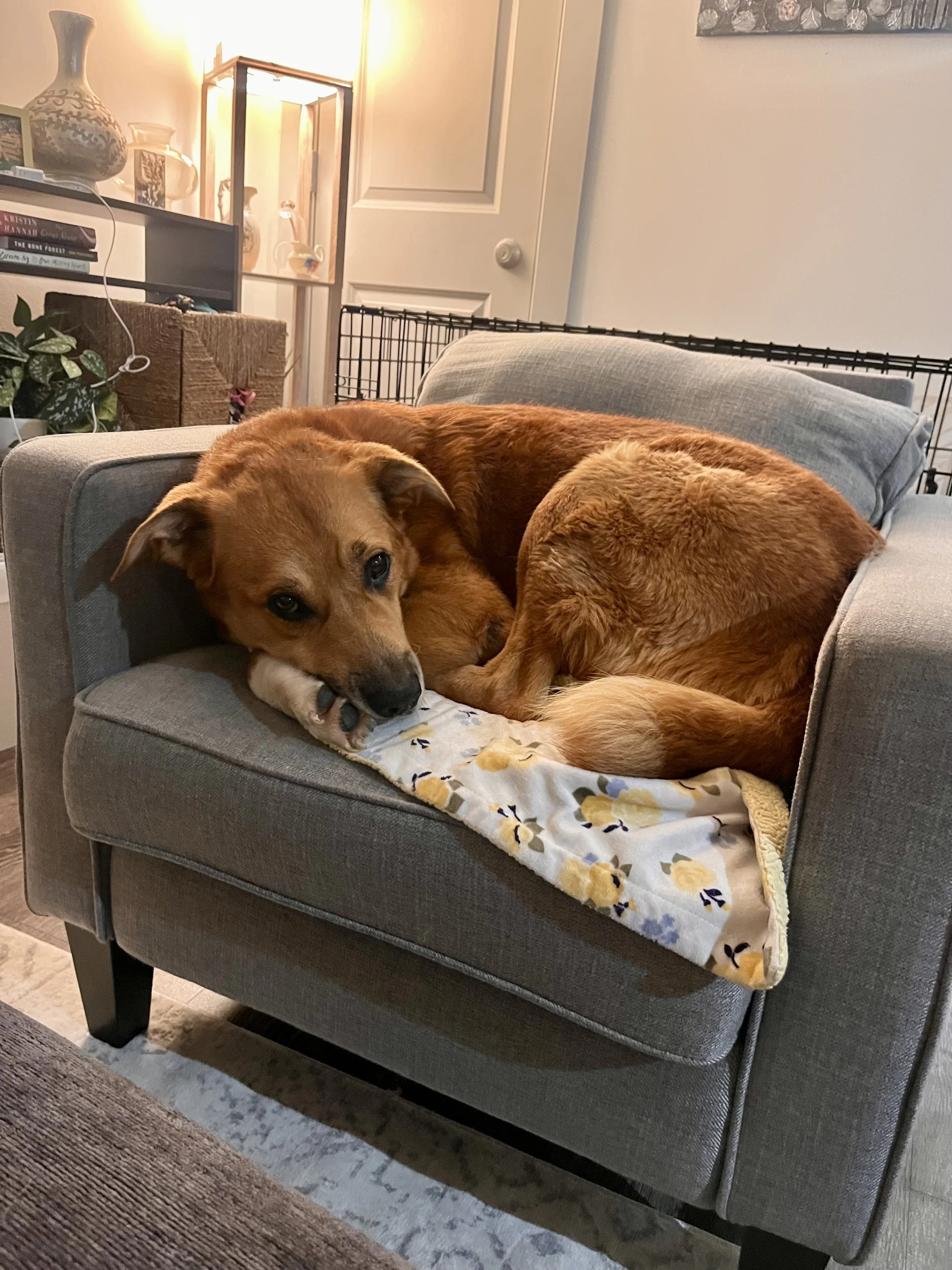 Buck is a sweet boy who is friendly and easy going! He has a low to medium energy level and typically receives about an hour of walks throughout the day, but he is fine with less when it's too hot outside. He easily relaxes inside and loves snuggling!