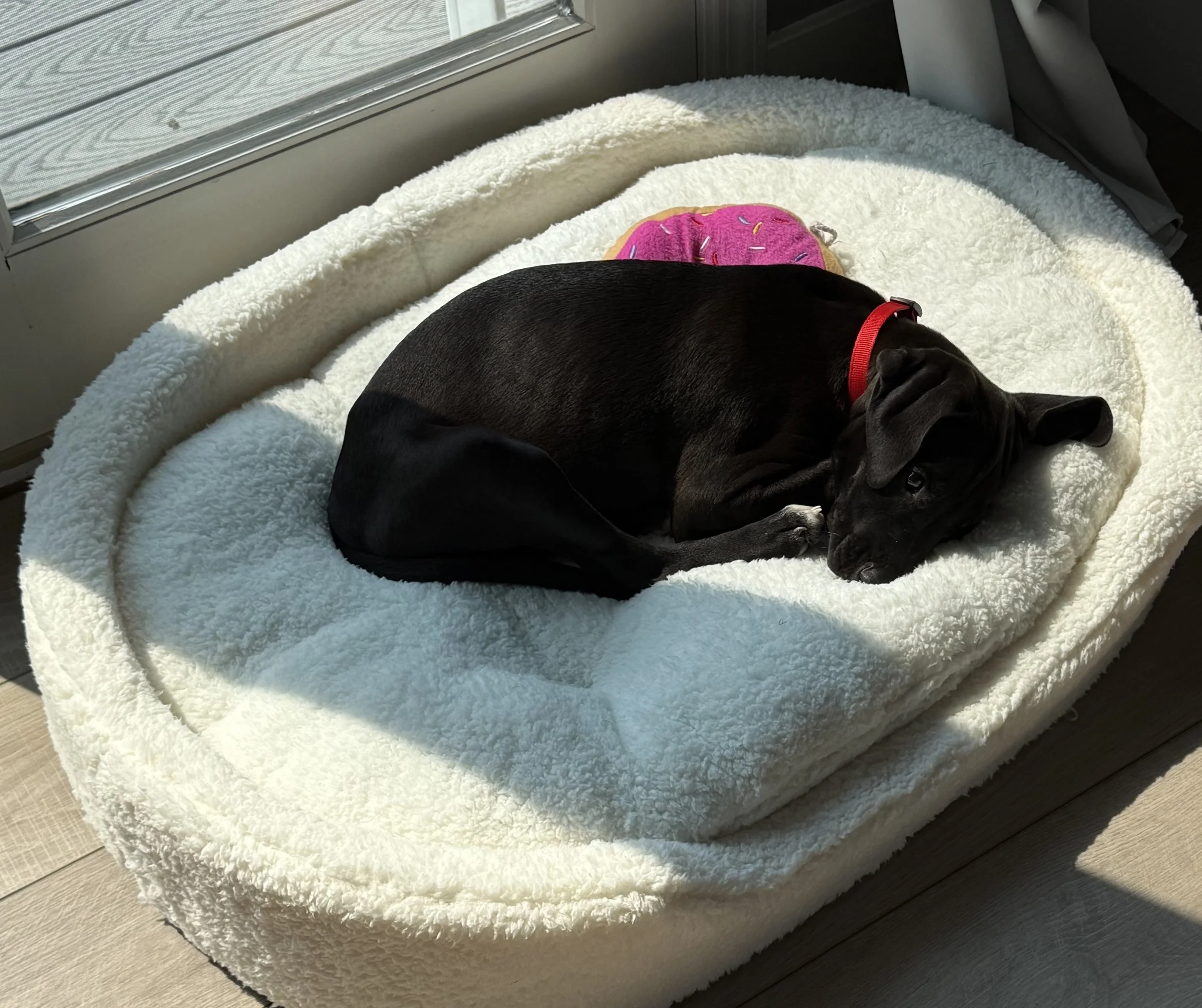 Charlamin loves to play, cuddle, and follow his people around, but he’s just as content stretching out in a sunny spot for some solo nap time. He’s a crate champ, doing great with potty training, and is steadily improving on leash skills with positive reinforcement and patience.