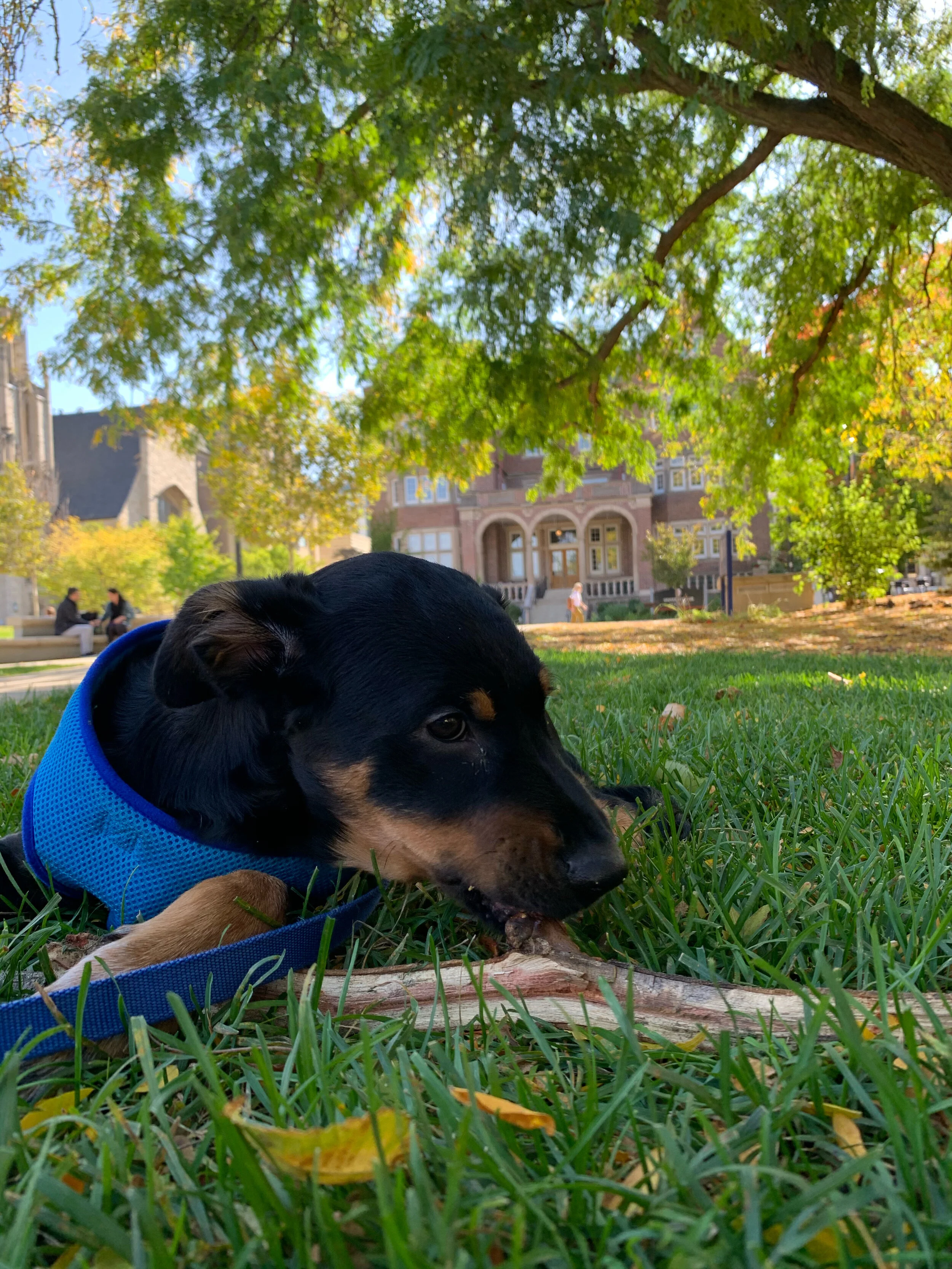 Charles goes on 4 walks a day (at least 3 miles throughout the course of the day). He lives in an apartment now, so he doesn't spend as much time outside as he wants to. He likes to run around and play. Charles is good on the leash and getting better; gets distracted when there are a lot of people around but is great in calm areas.