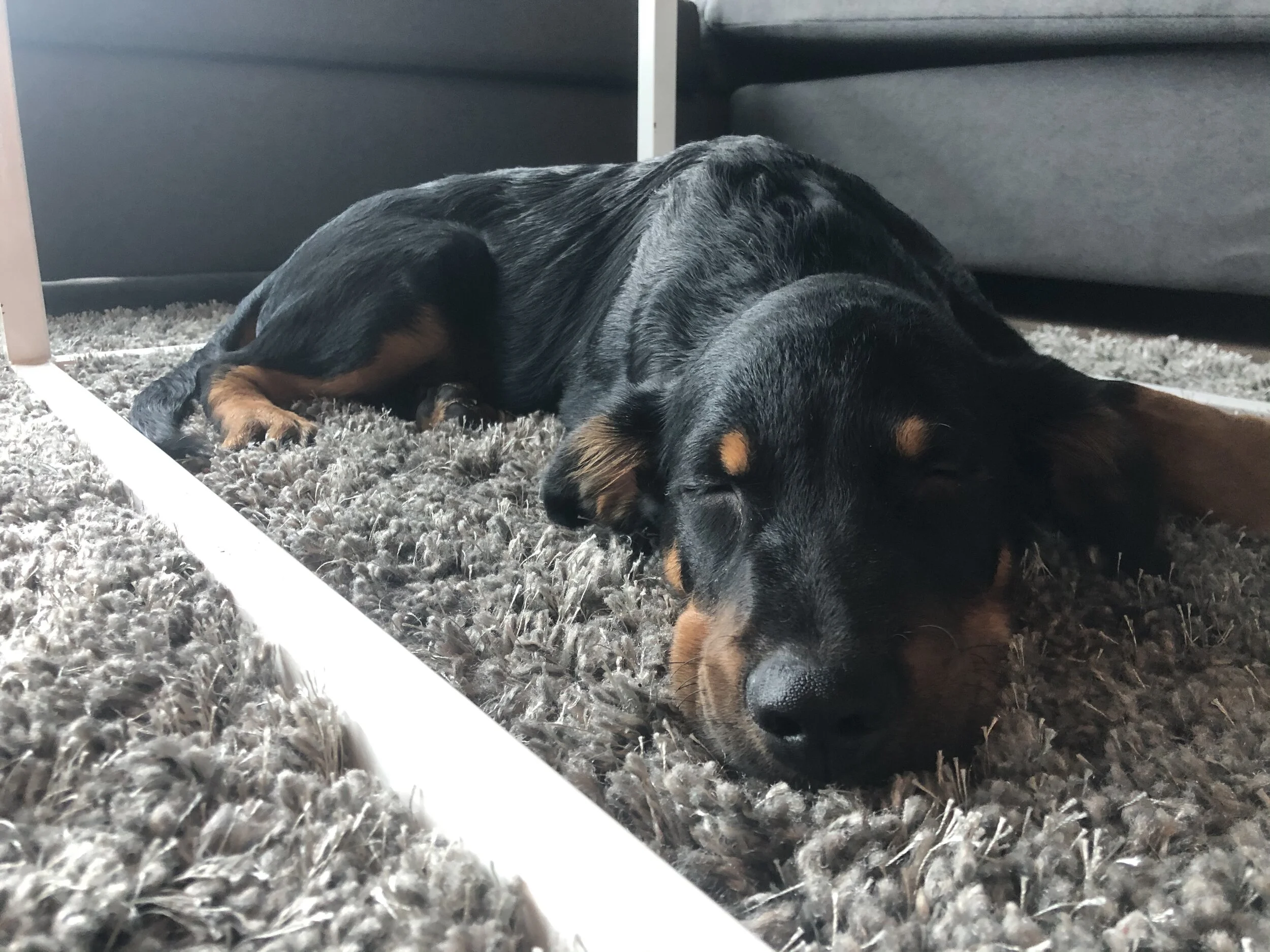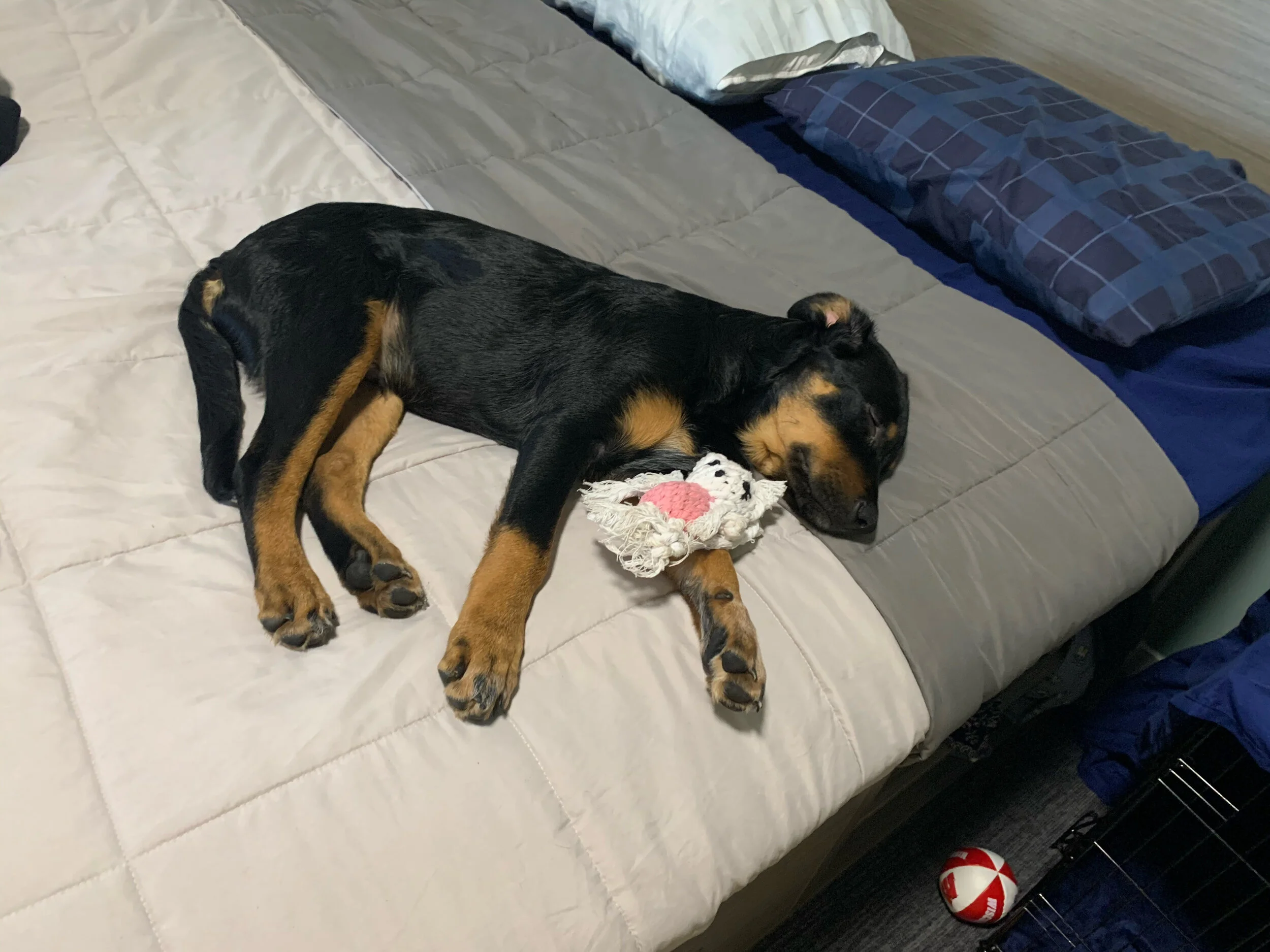 Charles wakes around 8:30 am and eats right away. He then goes for a 30-40 minute walk. Charles sleeps until around noon. He goes on another walk after lunch and then runs around off leash in the courtyard in my apartment building. Then he is low energy until he eats dinner around 5 pm and goes on another walk. Charles spends sometime in the crate, goes on a late night walk (around 9:30 pm) and then goes to sleep.