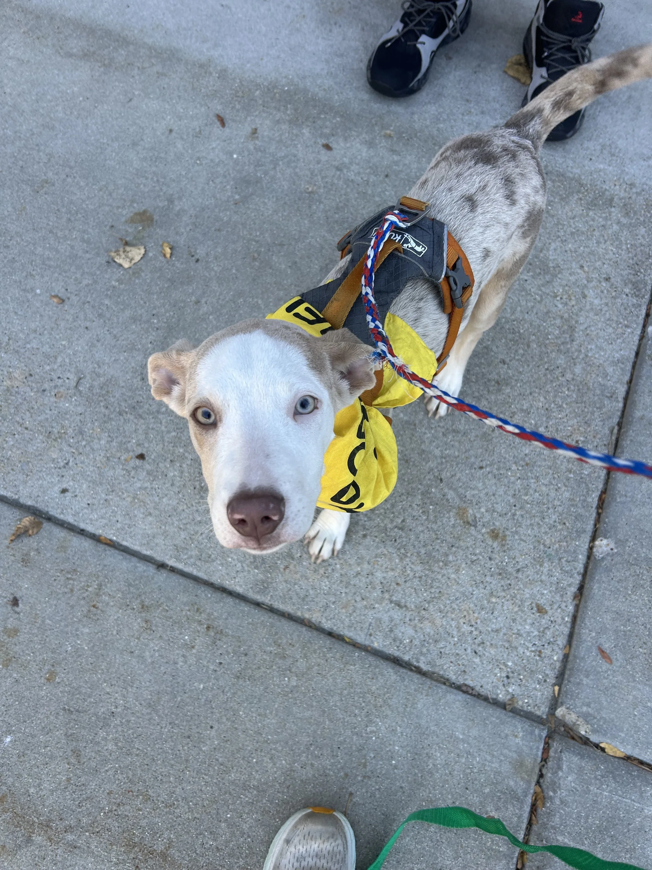 With his unique sea-glass green eyes and stunning Merle coat, Cheers is as unforgettable as his name. This classic, happy-go-lucky pup is curious, playful, and always ready for his next adventure — discovering the world one paw at a time.