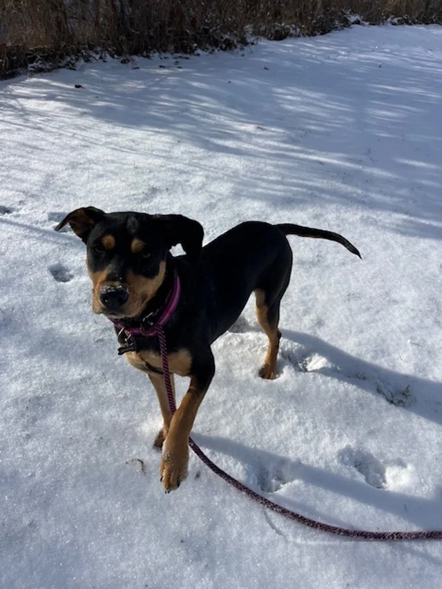 She’s learning the ropes of winter too: snow was confusing at first, but now you can find her rolling around in it. Around the house, Church proudly serves as an excellent crumb cleaner and puts her impressive nose to work finding any stray morsels. Despite being very food-motivated, she’s incredibly gentle when taking treats.