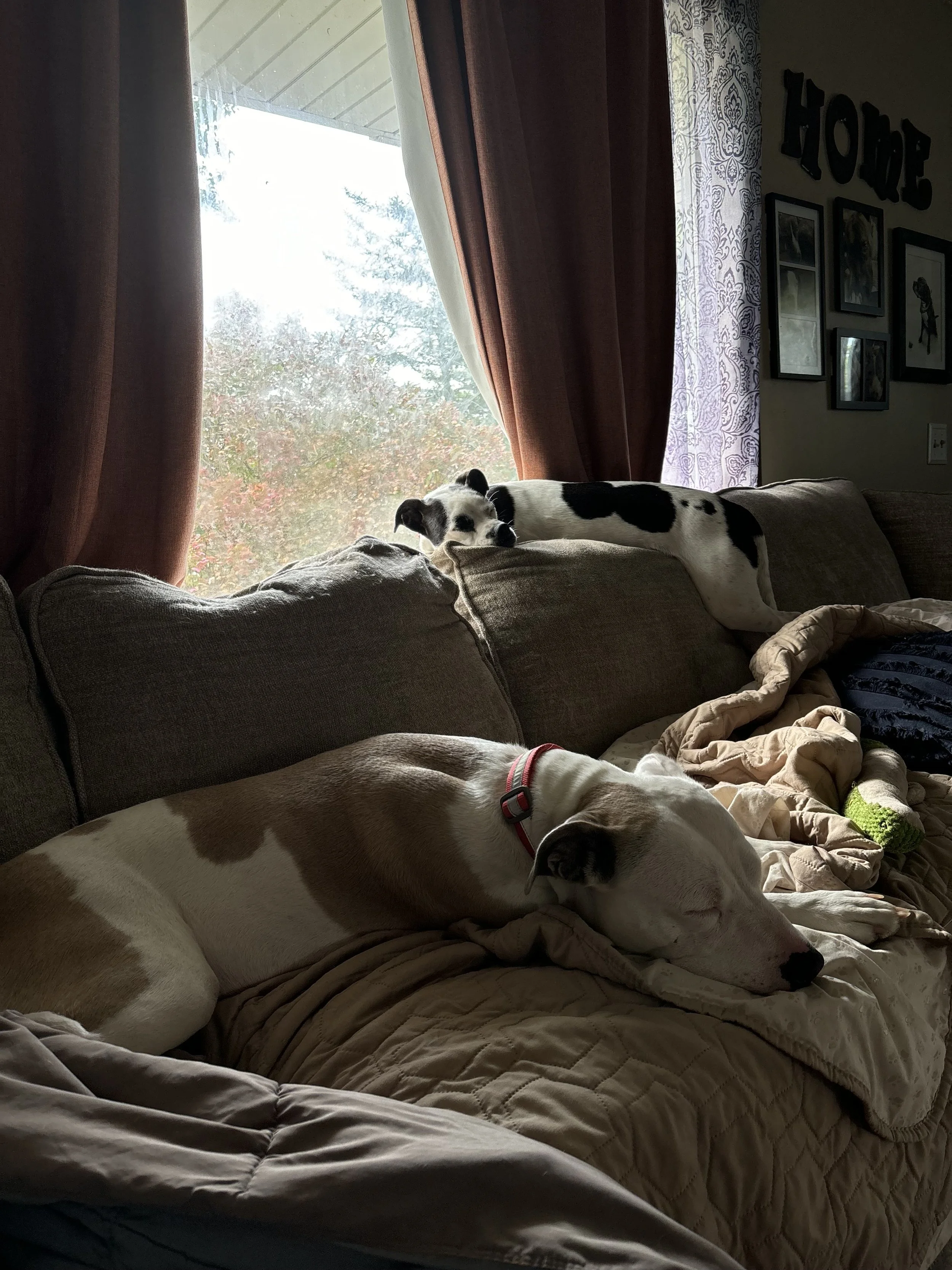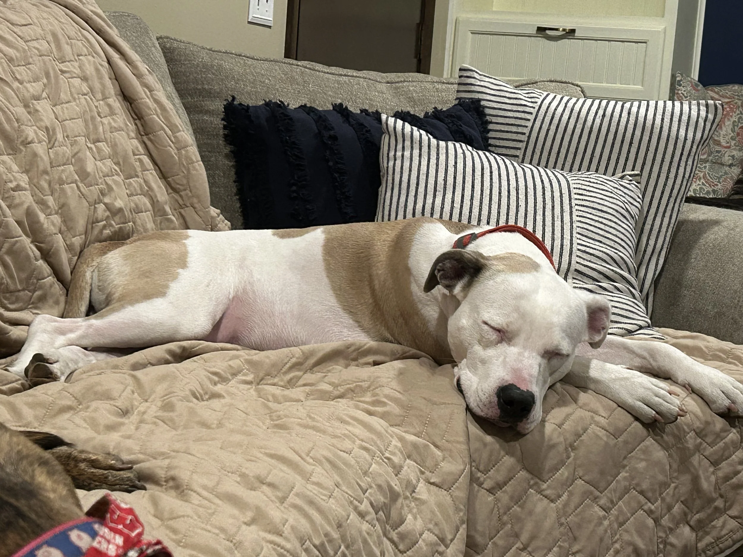 Clara is the sweetest, easiest, gentlest snuggle bug around. I call her the plopper, cause she loves to just plop herself right on your lap. Clara is mature, potty trained, and could be trusted to roam at home alone. She loves to snuggle at night, but she’s also happy to sleep in her designated comfy space. She will sleep in with you, get up to potty and get some breakfast, then return to snoozing. She loves walks and playing with other dogs. When you get home from work, she’ll greet you with the wiggliest butt and tippy tap paws. She’d also be content to lounge around all day. When super excited, she might jump up, but she is easily correctable.