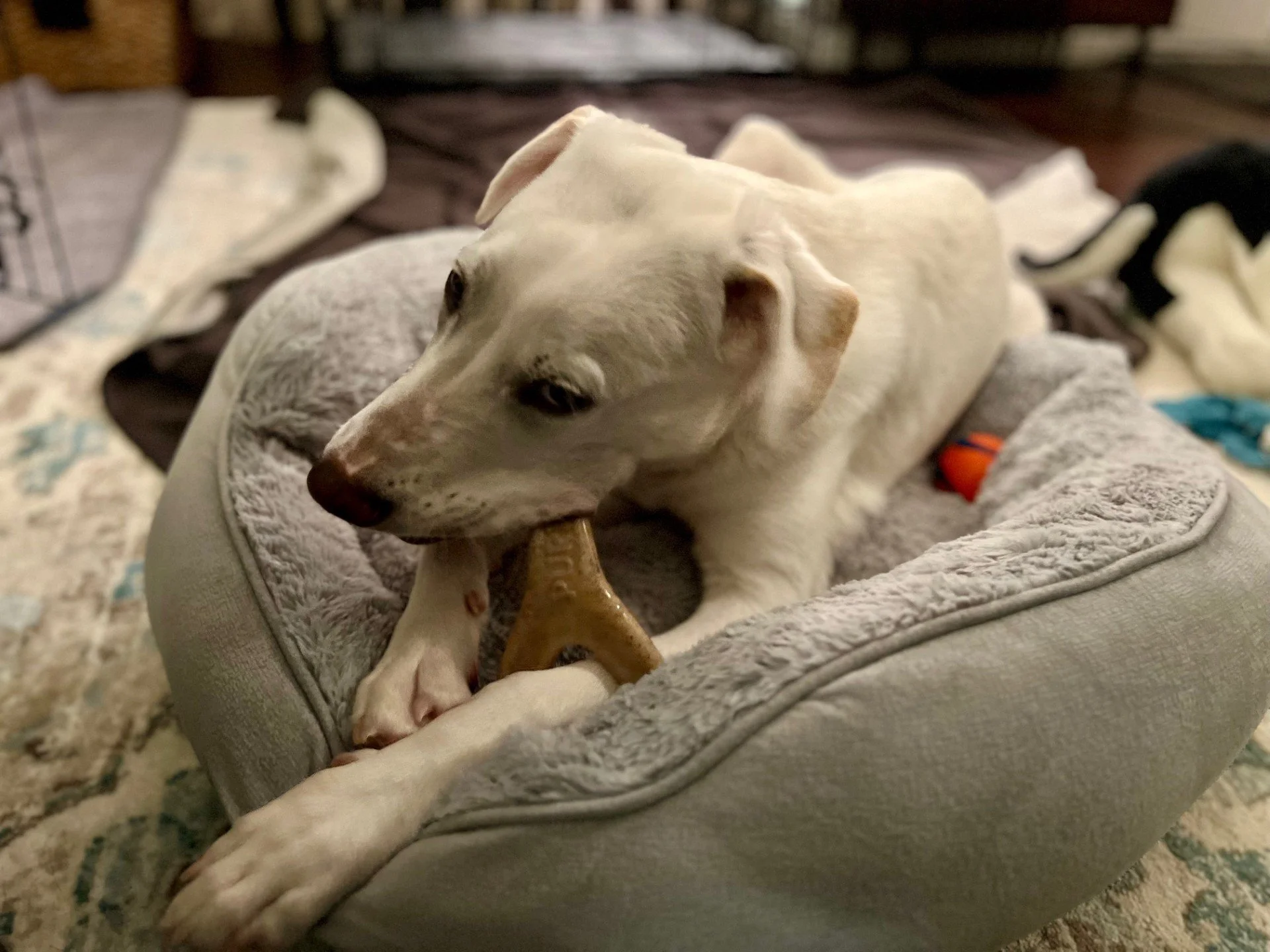 Dallas has also learned that humans are not sentient chew toys. Some teenage mouthiness is still there (for now), but is limited to situations in which he’s overstimulated. For that reason, living with young children may not be ideal. Dallas does respond well to corrections, and his highly food-motivated nature makes him an eager learner.