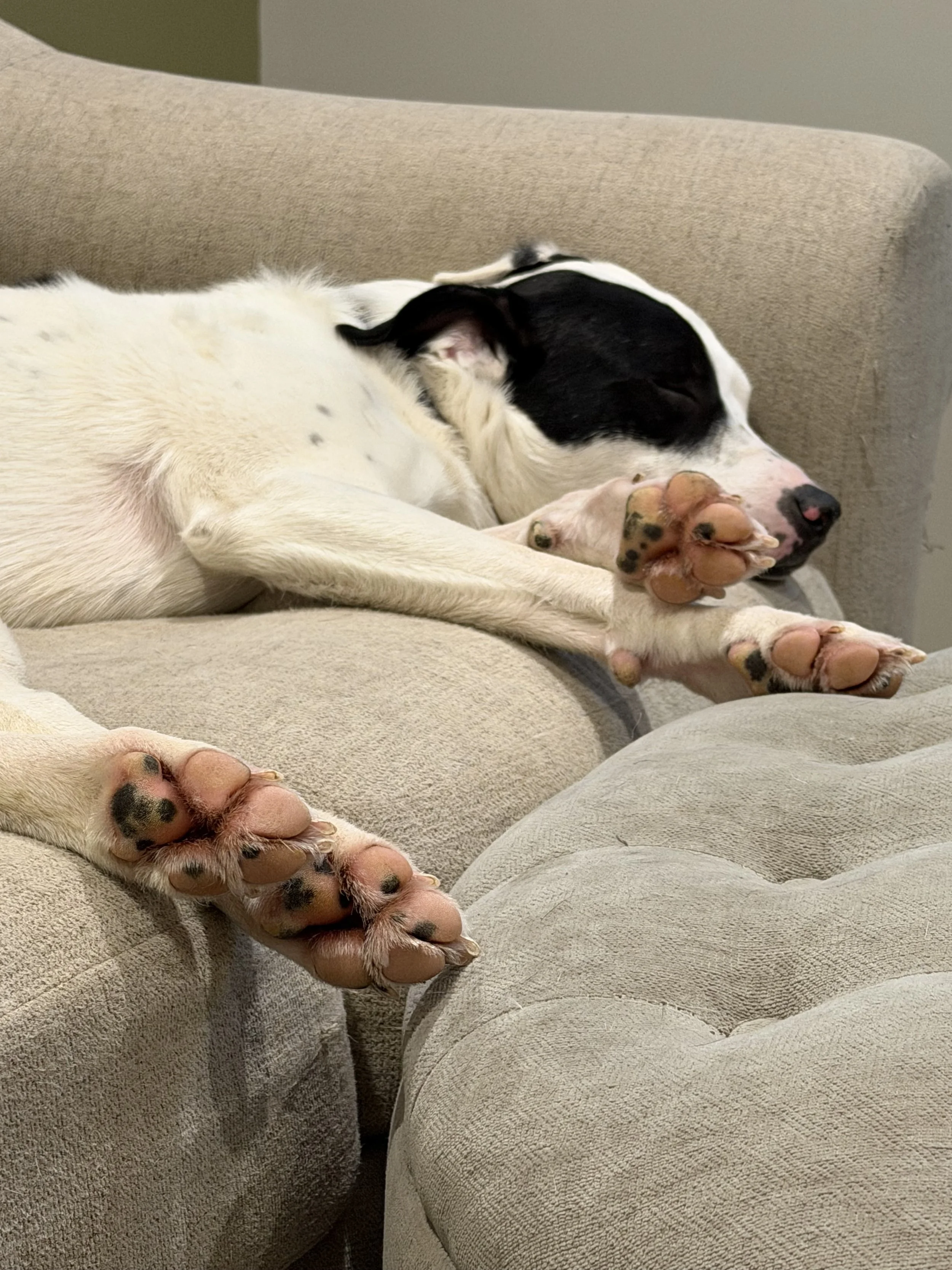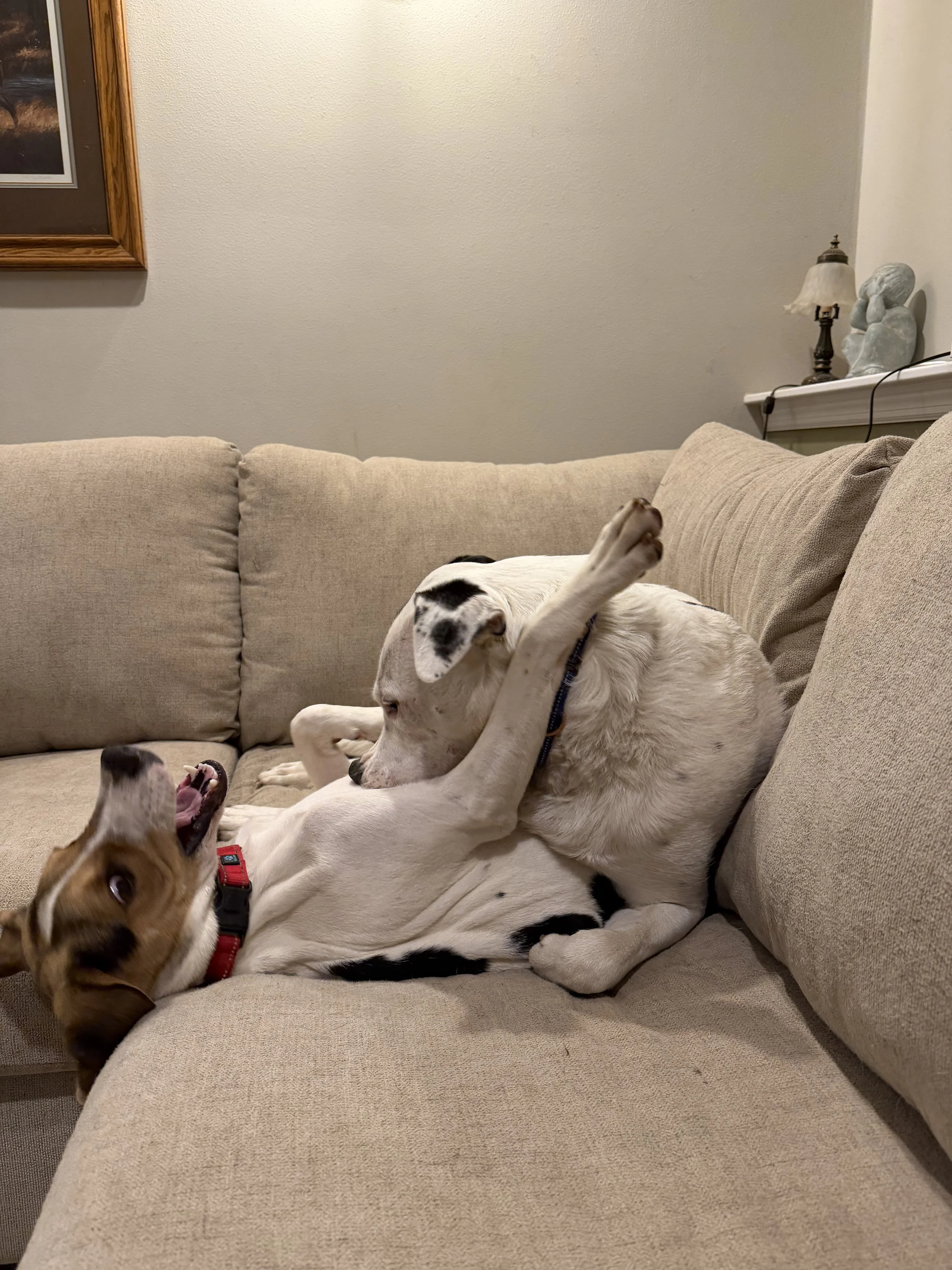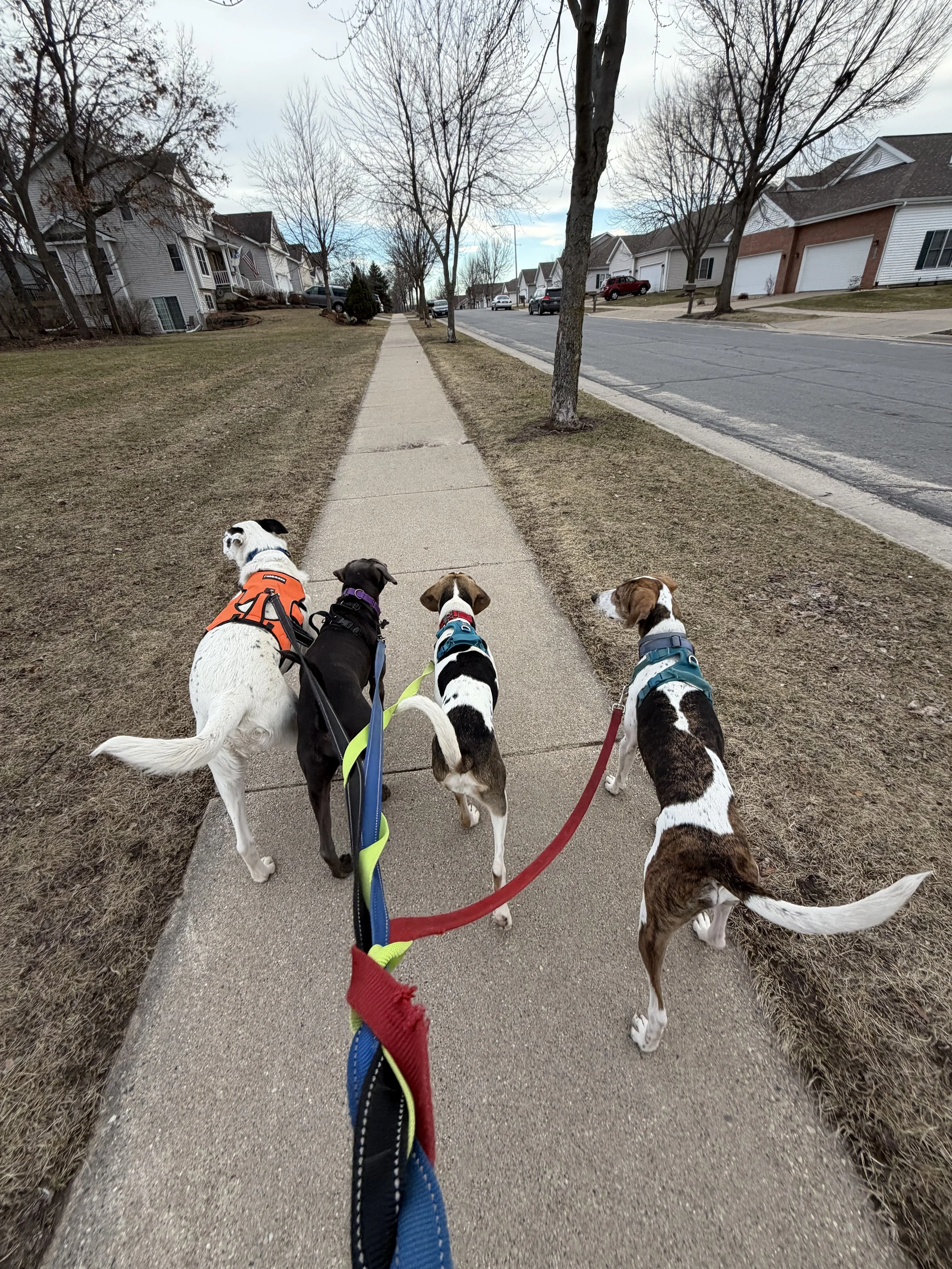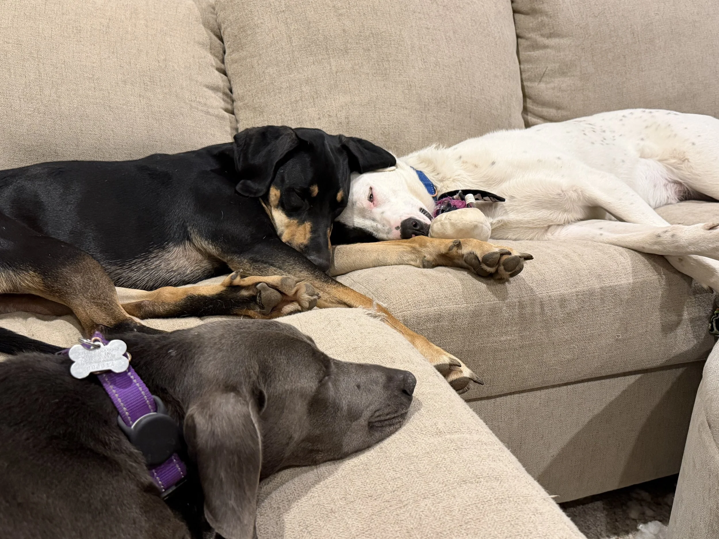 Demo has mostly been learning how to live in a house while in Wisconsin and that his foster mom and visitors are safe. Demo is a major creature of habit. He runs to his kennel for meals. He waits on the deck for the resident dog to go outside with him so they can leap off the steps at the same time and run to the back corner of the yard. Did I mention that he loves other dogs?