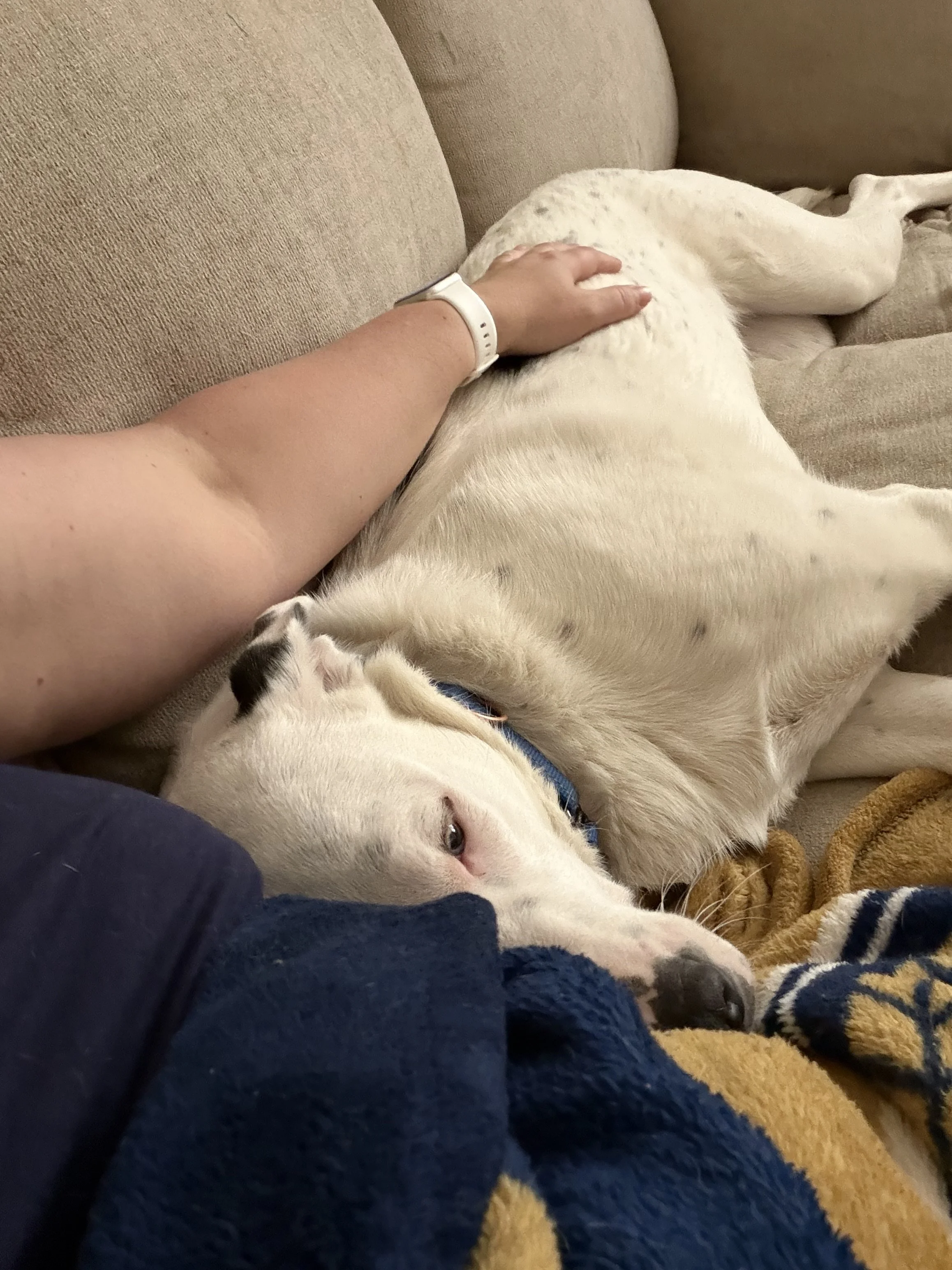 When Demo meets new people, he follows the resident dog and mirrors their behavior. He is gaining confidence and learning a lot. Demo will lie on the couch to hang out with his foster mom and sometimes even snuggles. He loves being on the bed and now allows you to snuggle with him and he’ll even put his face against yours to snuggle in. He’s gaining so much confidence and trust! He’s even starting to let his foster mom pet him while walking by in the house.