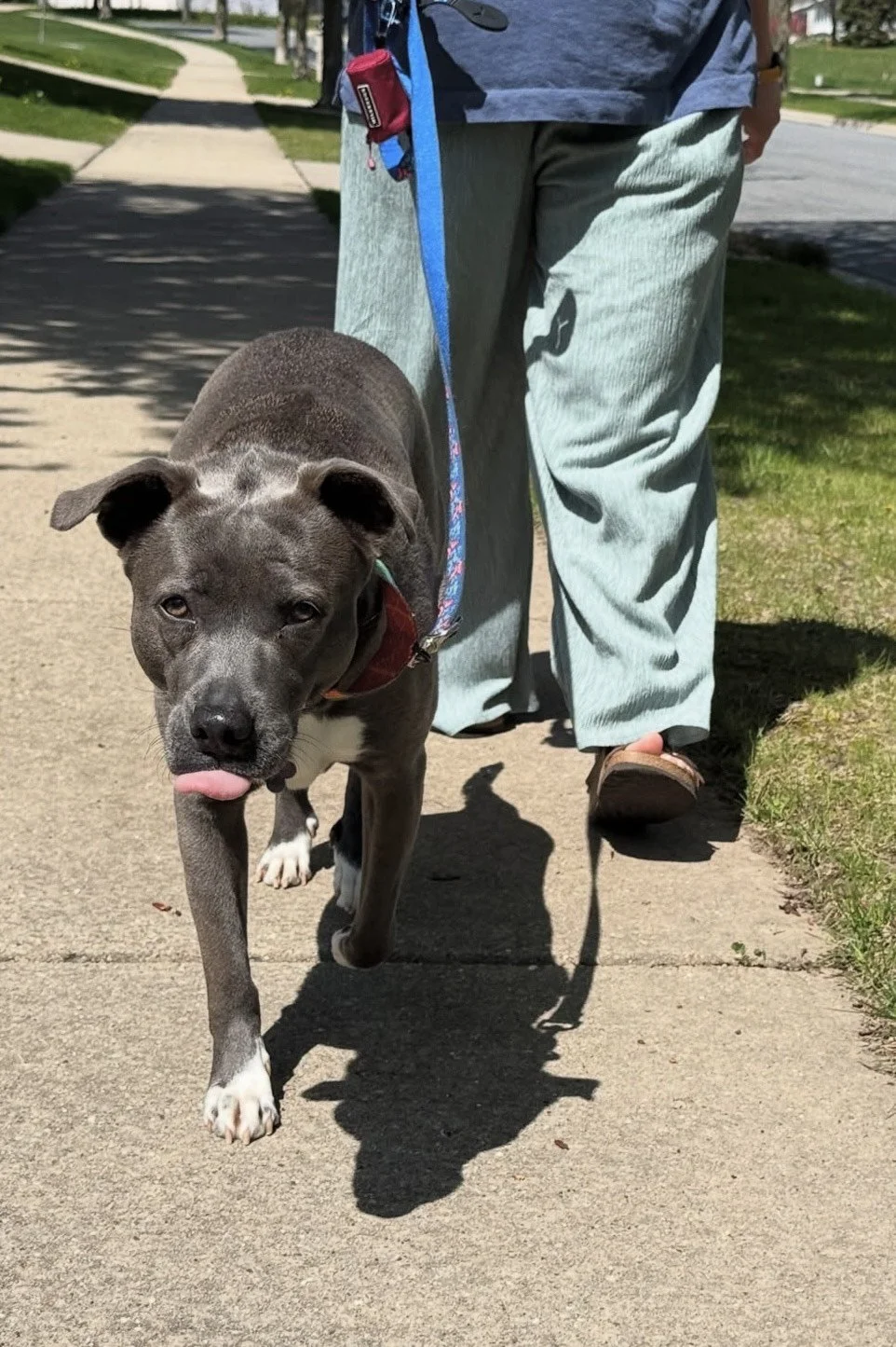 Diamond walks well on leash, and prefers leisurely strolls with lots of sniffing and joyful rolling in the grass. She’s a curious girl, and will occasionally lunge at a squirrel or bird. Diamond is working through leash reactivity towards other pups, but can be redirected with treats.