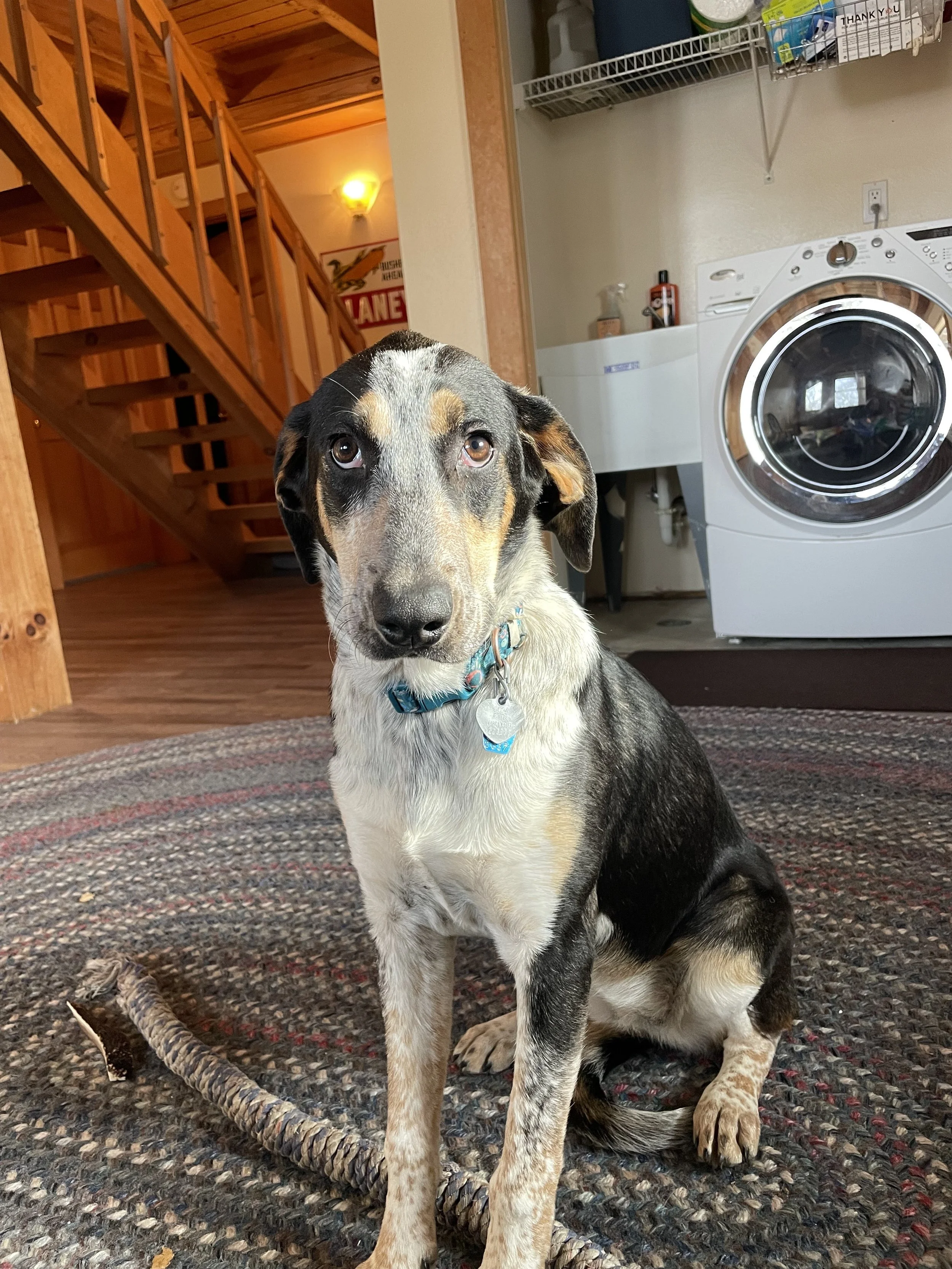 Dixie has recently mastered going up and down stairs . She is working on car rides , garage doors and everything new in and around the house.