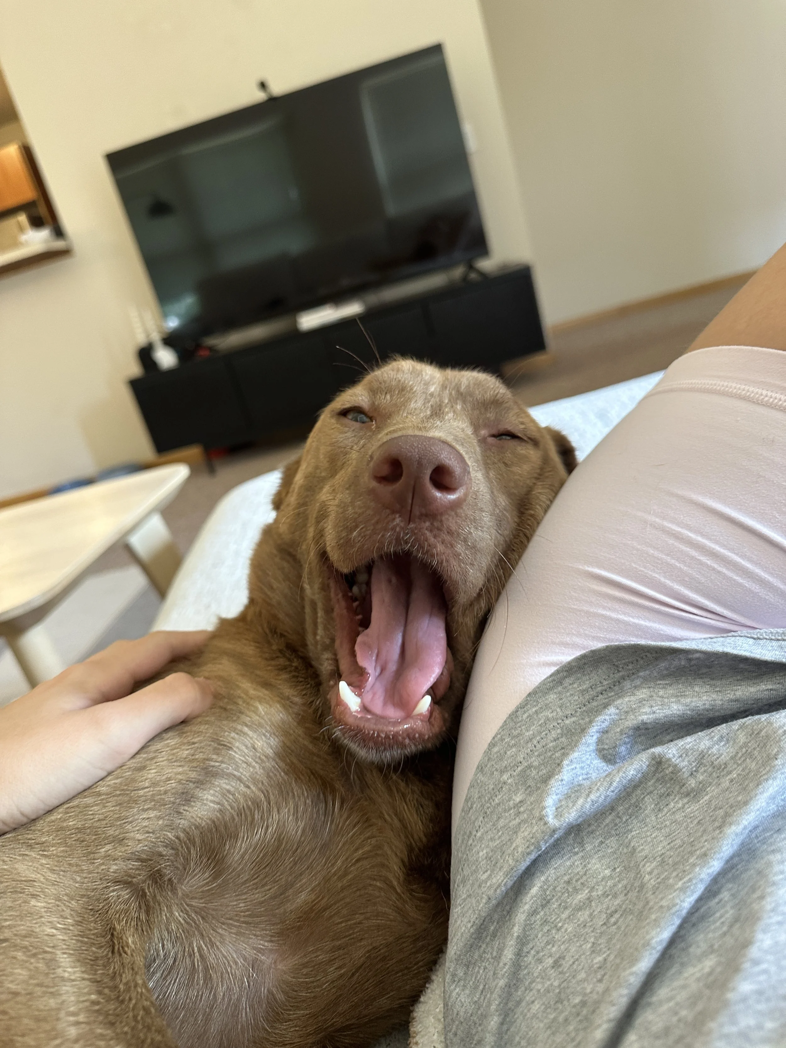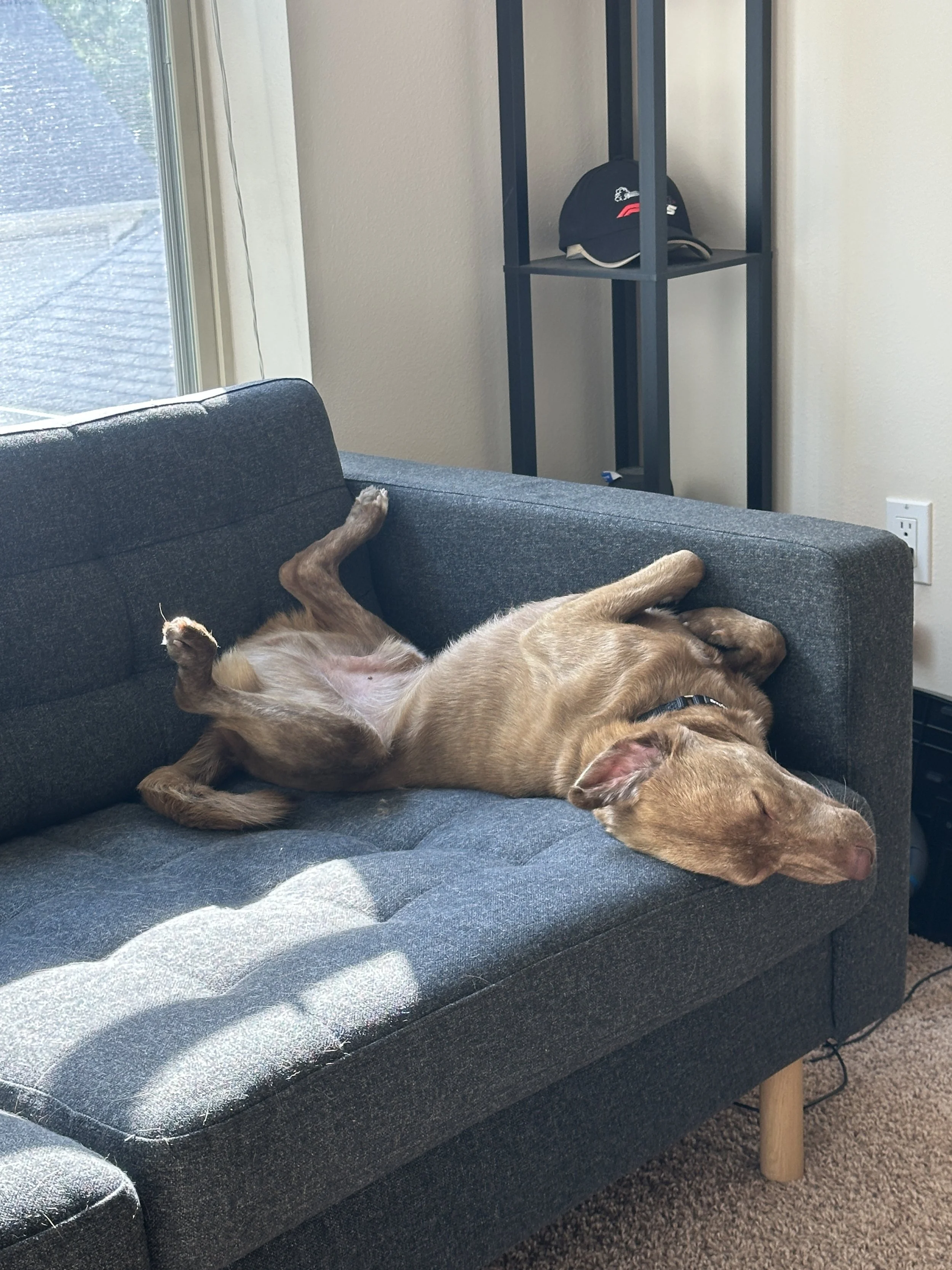 Finley is a submissive pup who is eager to please. He’s still learning commands like “sit” and “stay,” but with time and consistency, we’re confident he can learn. He’s also fully house-trained and crate trained, though he may have small bladder leaks if he is scared. On a typical day, he’s such an easy and mellow guy who enjoys napping on the couch and entertaining himself with his favorite toys!