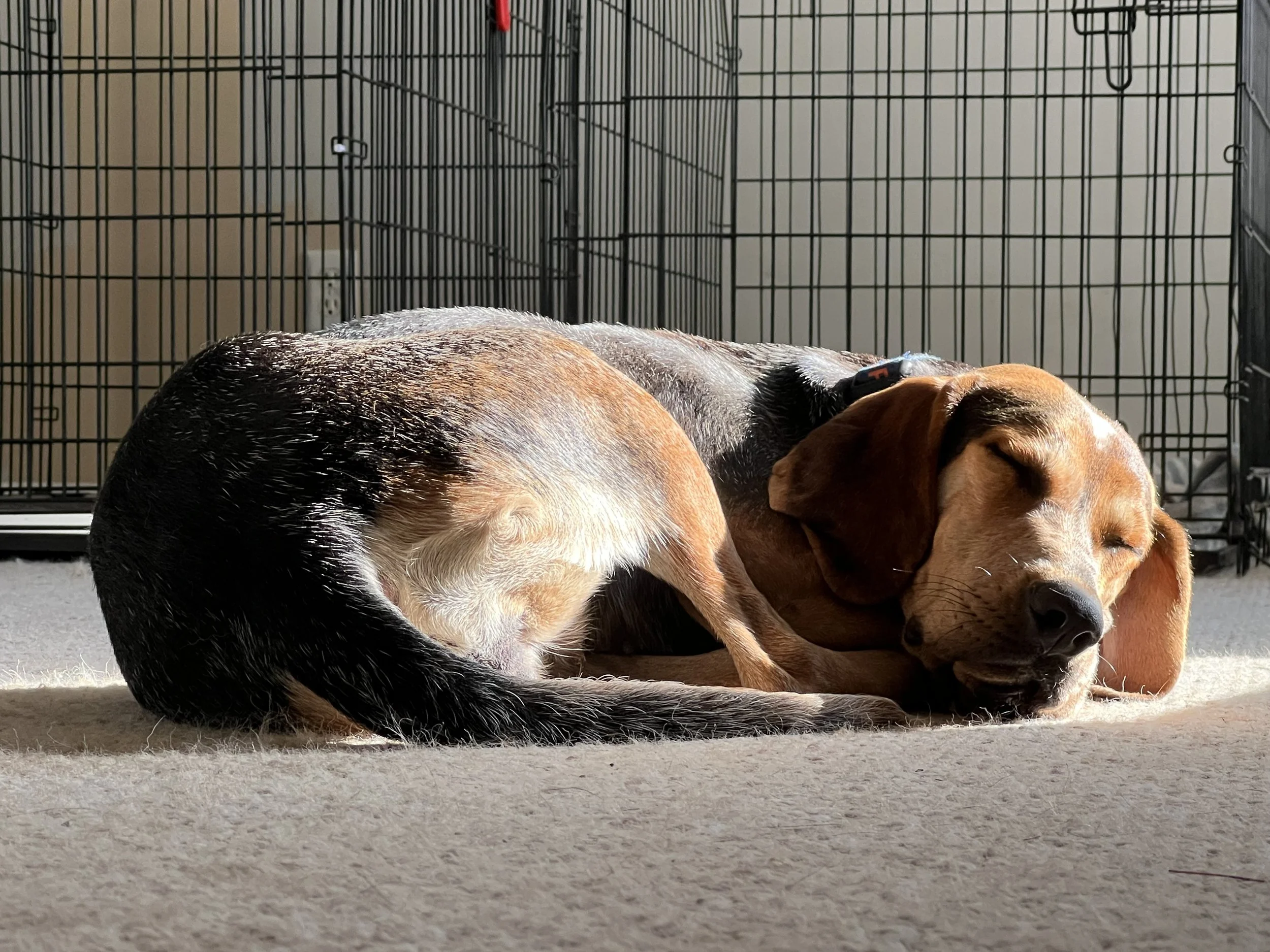 Flow easily goes in a kennel without any fuss for a chicken strip. She will happily snuggle up on her plush blanket and take a nap during the day too.