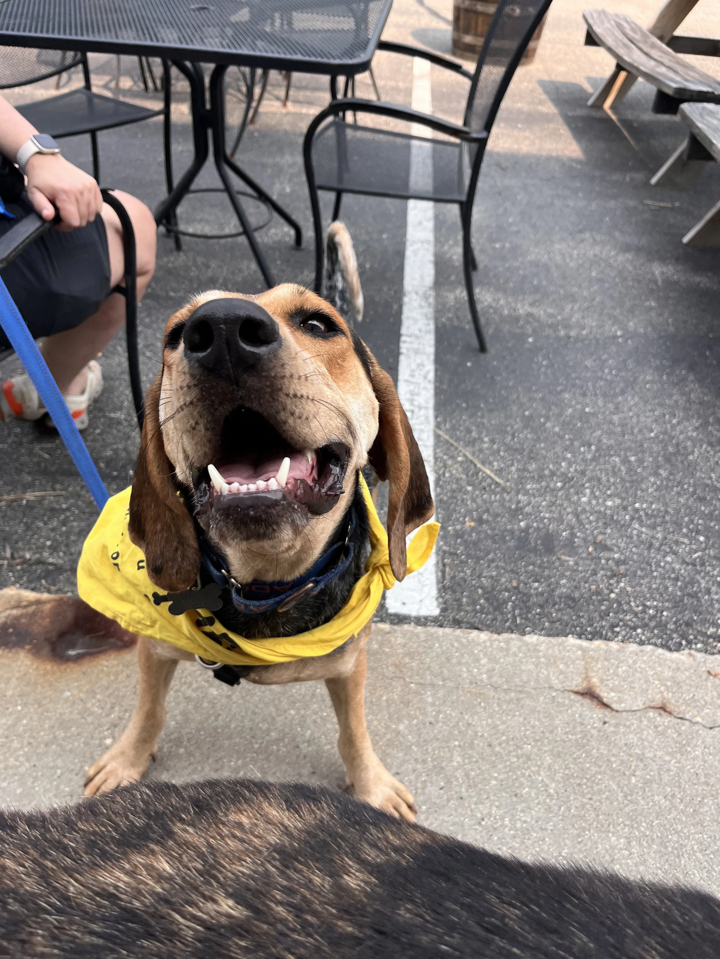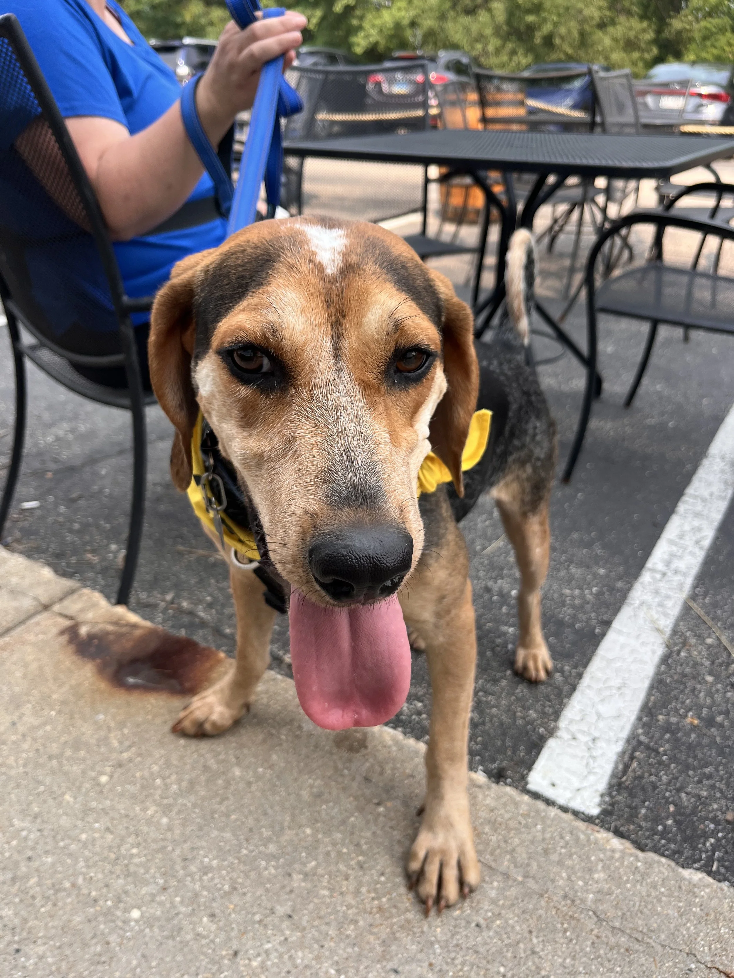 Flow is a typical hound on a leash. She will sniff the air and ground on a walk and sometimes get stuck on a scent. When she’s not on a scent she’s a decent walker and just saunters along. Flow is working on learning commands that you would learn in a basic dog obedience class in her foster home.