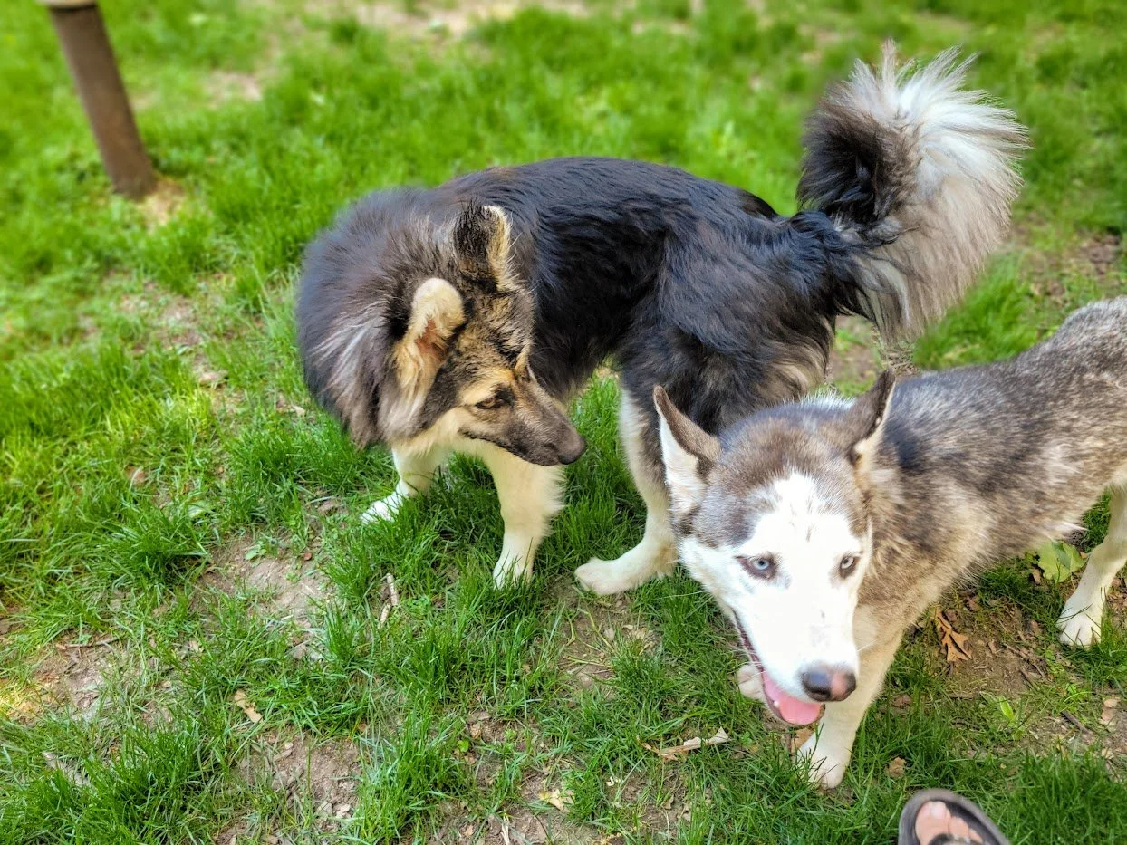 Speaking of dog parks; Funnelcakes is currently hanging out in a multi-dog foster home and loves having other dogs to play with! The bouncier and more playful, the better, according to her! She has been very appropriate and respectful with each dog she’s interacted with thus far — ranging from 15 lbs. to over 80; males and females alike. When she, or they, are done playing, she’s content to flop down in the grass and recharge.