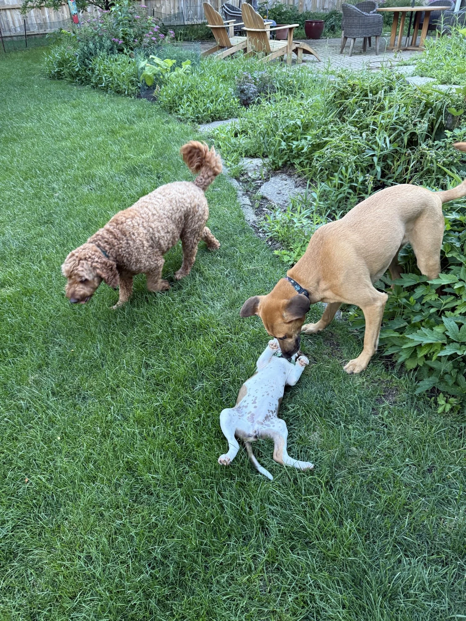 Gracie is doing a great job of having quiet time in her crate throughout the day and is sleeping through the night! We’ve been often putting her to bed around 10 PM and she’ll start to make noise around 6 AM. She has done a great job of reading our older dogs cues, and has shown she can take redirection from other dogs appropriately.