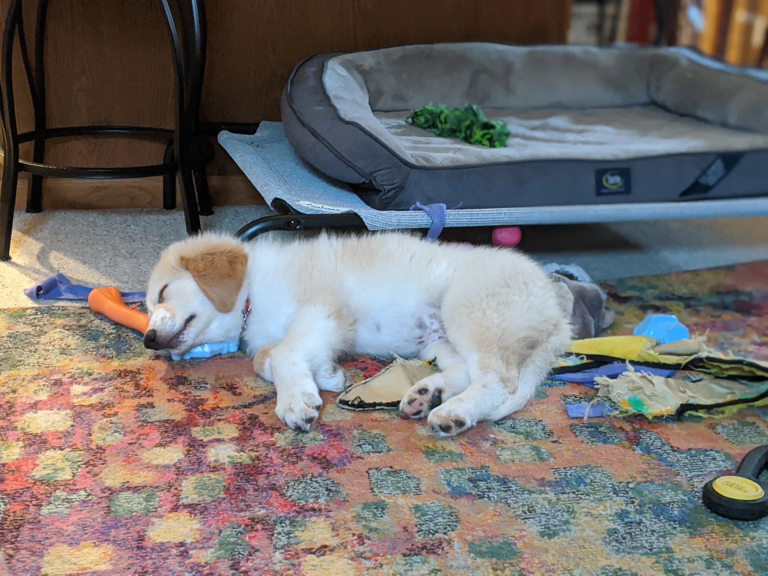 Gretzky isn't left alone too often these days but when we do leave, he needs to be crated as he is still very much a puppy. He will chew on cords, shoes, scraps on the floor, etc so will need to be closely monitored. We practice crating while I work (crated in the same room) and he stays quiet/settled for up three hours before he needs a break. He will fuss if I leave the room but settles back in when I return. He settles in quickly at bedtime (crated in our bedroom) and is quiet through the night up to six hours or so.