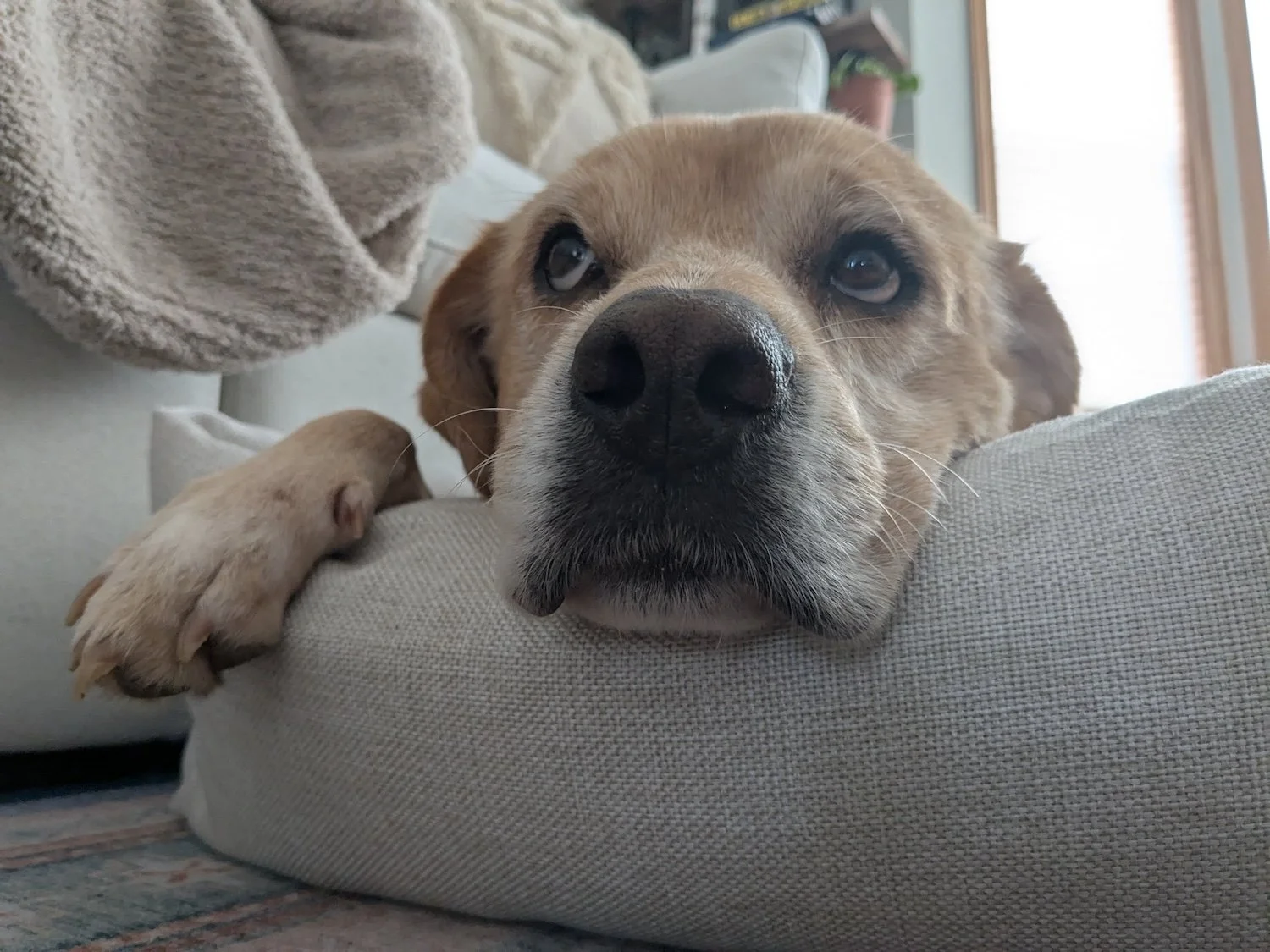 If you’re looking for a calm, affectionate companion who prefers quiet company over chaos, Griffen might just be your guy. At 7 years old and 51 pounds, this neutered Labrador Retriever Mix has perfected the art of being gentle, polite, and just a little dramatic — especially when he gives you those big sad eyes.