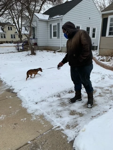 Griffin is a medium energy dog. He has the most energy in the morning after he's let out of his kennel and in the evening after dinner. Griffin doesn't have a lot of experience walking on a leash and is not a fan of the cold Wisconsin weather, so we haven't been on many walks. He does get let outside on a leash and he does ok. Sometimes he'll chew on the leash or decide to be stubborn and pull, but he's easily redirected if I call him excitedly and/or have treats. This is something he will need more practice with.