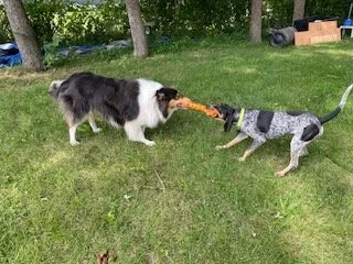 Honey, a very playful energetic dog. She loves to play with anyone who will give her attention whether that be a person or another dog. She is still learning how to share her chew toys though and will need some help in finishing her potty training but she’s mostly there. After a day of playing and exploring she enjoys a good snuggle in bed and will even join you under the covers.