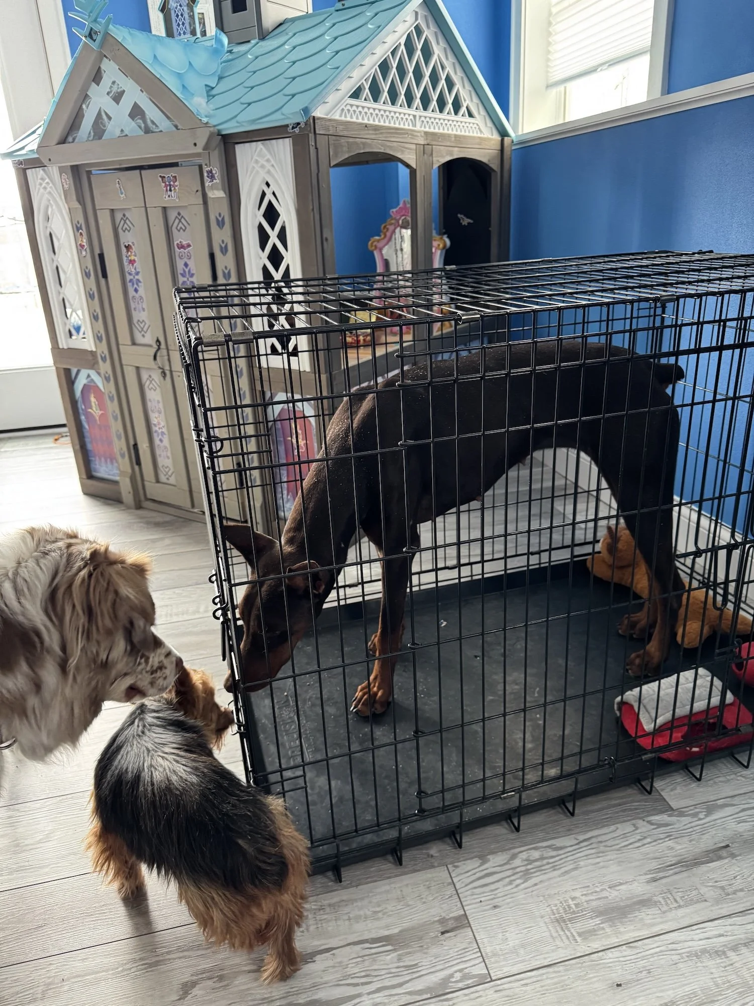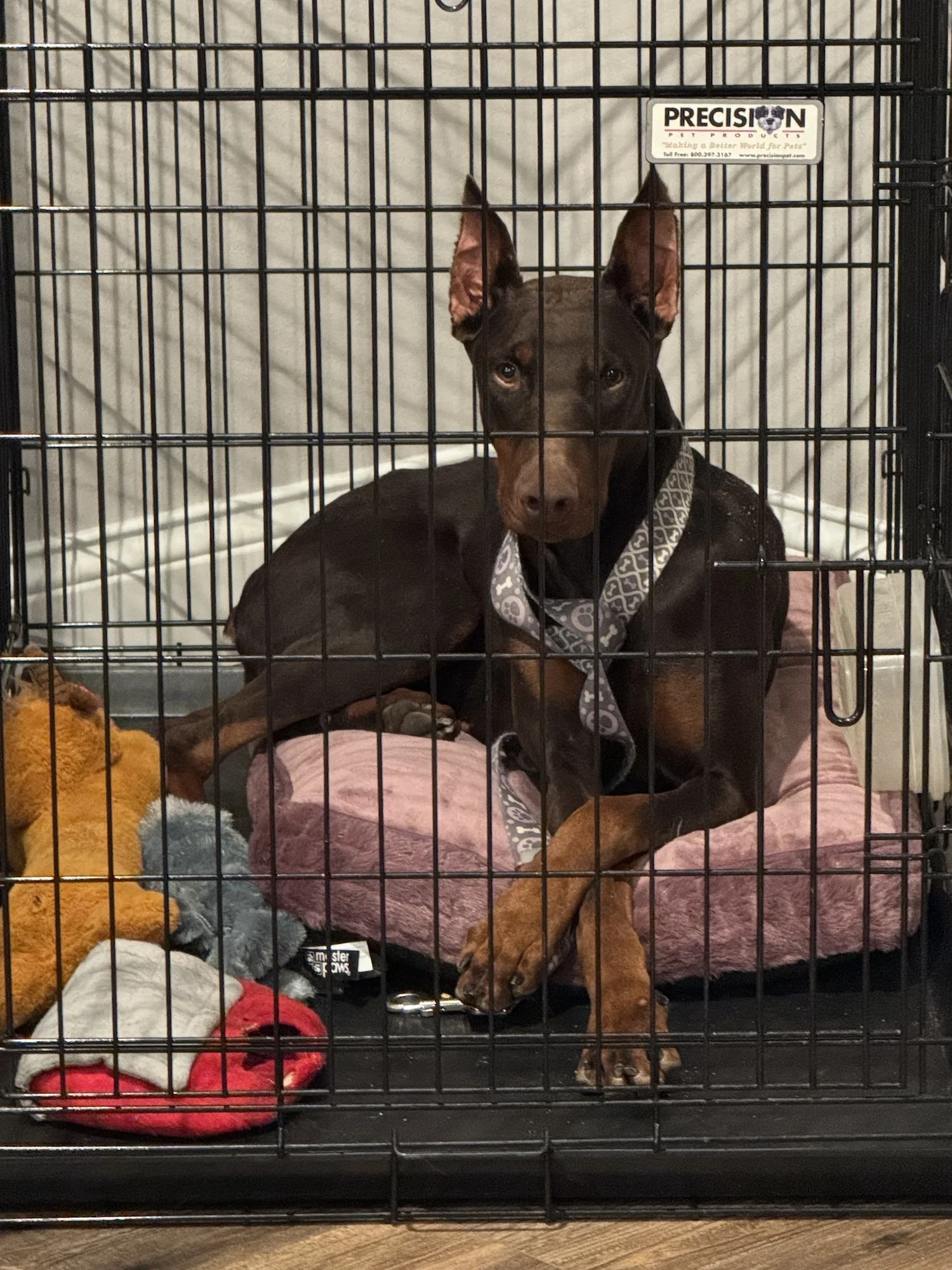 She isn’t a huge fan of going into her crate, but once she’s in she settles quietly, keeps her kennel clean, and doesn’t make a peep.