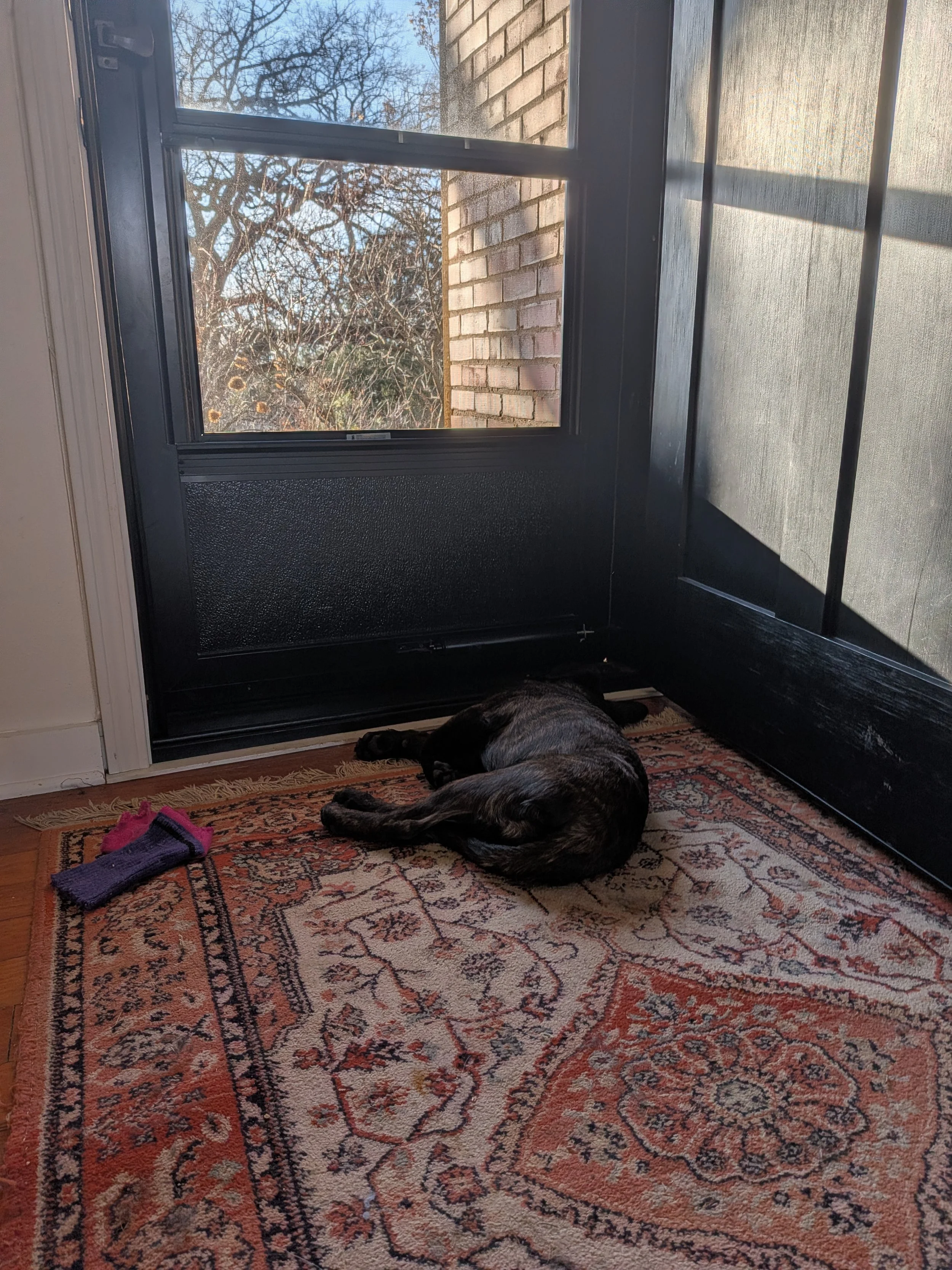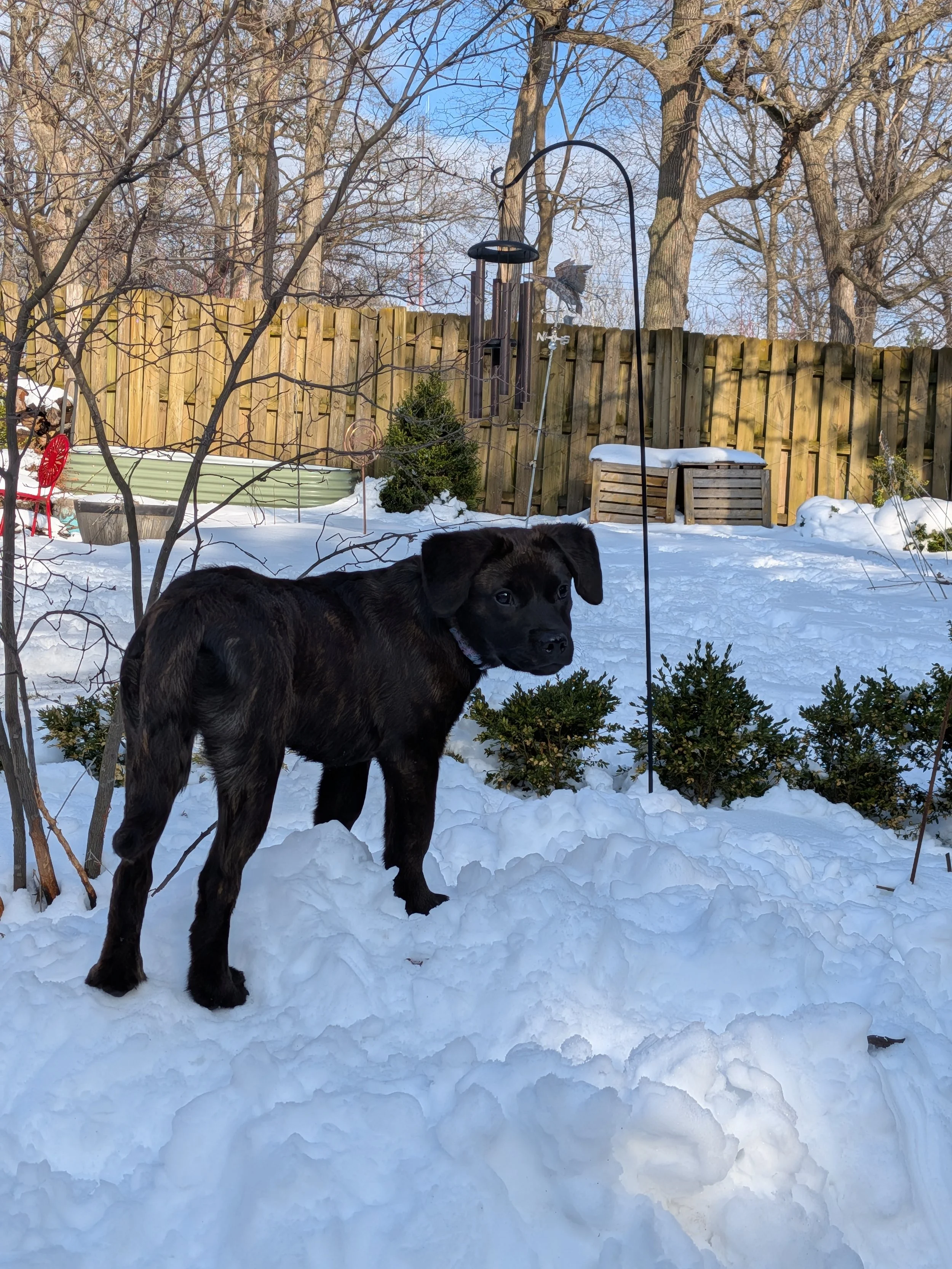 Routine: She is continuing to master her crate and potty training. She is very comfortable overnight in her crate and is excellent about asking to go out by pining at the back door.