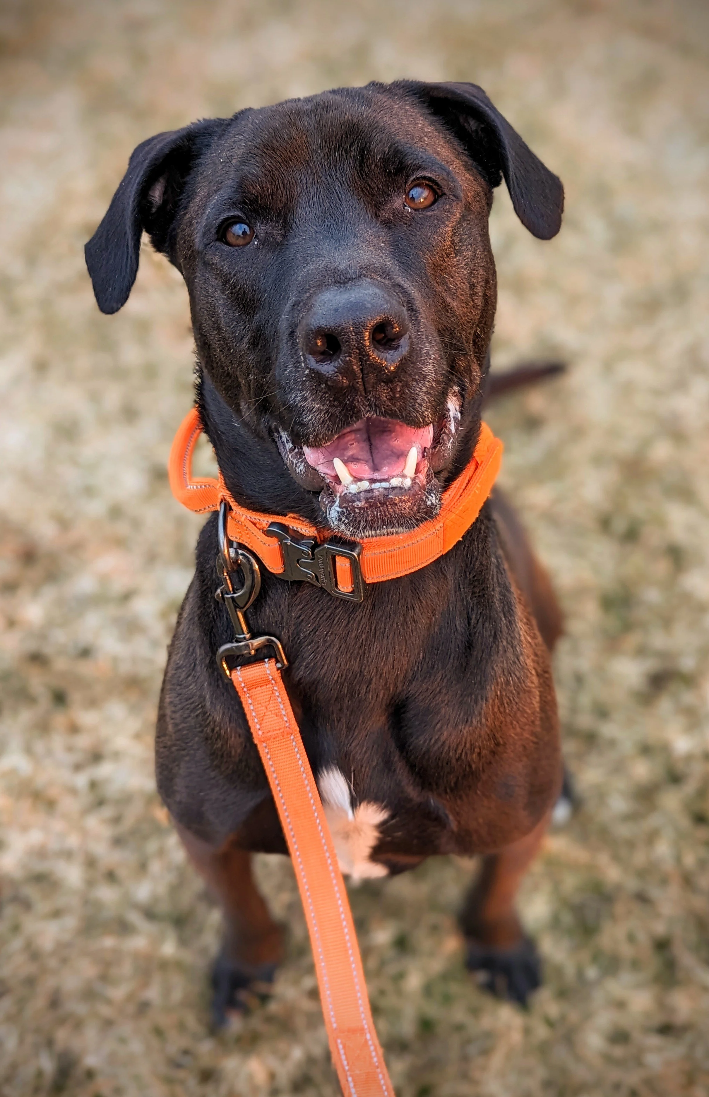 This dog has been through a lot. Despite it all, he is a wonderful and loving boy with the people he trusts. He has so many great qualities. He’s playful and bouncy, but also has great body awareness. Even though he’s a big boy, playing with him always feels safe and fun. For some reason, he thinks we can play tug with very small toys like balls. I really tried for him. My fingers are not that strong. He’s a medium energy dog and is very good at matching the energy of those around him. You can hype him up or calm him down at the drop of a hat. He loves to zoom around the yard with my dog, but relaxes easily in the house when his needs are met. I have taken him on two 20 minute walks a day and given him some time to play and zoom in my yard. He doesn’t seem to need more than an hour of active time spent with him. He loves to lean his weight into his people and get those good scritches. I’ve been letting him free-roam my home and he has been no problem at all. He doesn’t grab or chew anything inappropriate, doesn’t counter surf, and has been a very quick learner. He’s very food motivated, but not out of control about it. He’s been respectful of my dog, who likes to have space, and he’s been an absolute joy to have around. I think he would be happy either as a single dog or with other dogs. He has also lived well with cats. When he’s excited, it’s reasonable and brief, and he doesn’t jump on me when I come home. He has some good training with leash walking and is a good walker regardless of what he’s wearing. He is ¾ of my body weight and I can’t even tell. He rides nicely in a car. He can be left alone during my 9-5 workday.