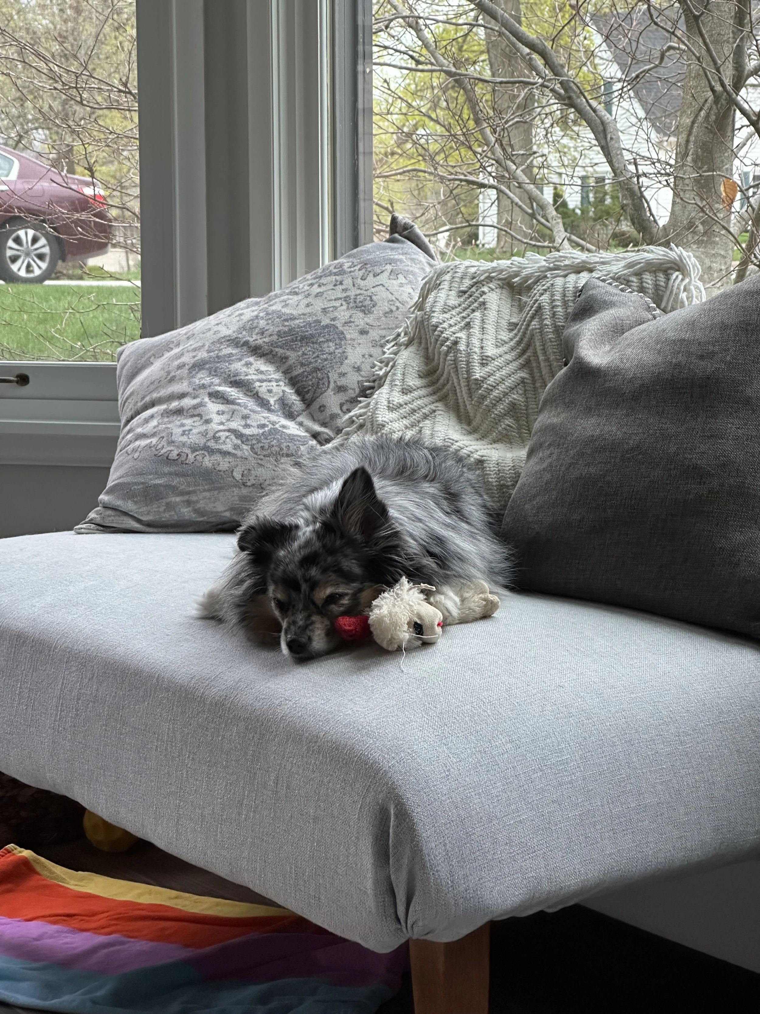 Madi is completely house-trained and is fine to leave unattended for a period of time. She does not do well crated, but you can trust that Madi will lay around and not get into anything if you were to leave her. Currently, she is left three days unattended for 8 hours and she has not caused any damage or disruption to our home while we are away. She also does not bark when you leave the home. If a dog is walking past your home, she will bark at the dog and the mailman. If you are home, Madi will want to be near you always, but tends to mind her own business. She does enjoy laying on the couch, so she would need an owner that is okay snuggling with Madi on the furniture.
