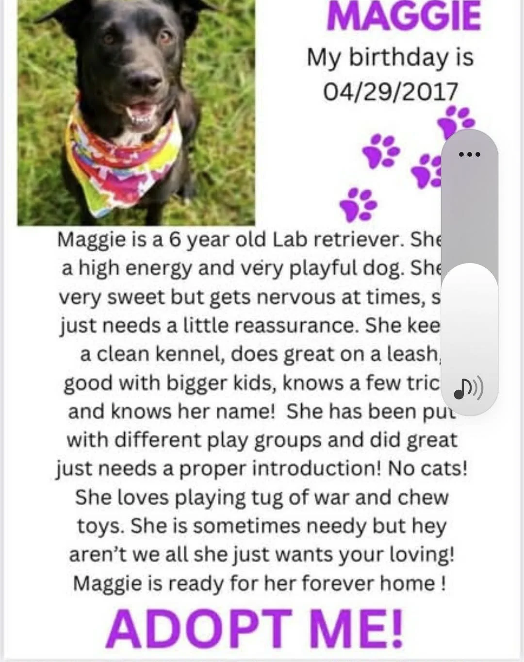 Maggie has waited far too long for someone to see her. She’s not flashy, she’s not demanding, and she’s not the dog who jumps up and down in her kennel. She’s the dog who blossoms slowly, who bonds deeply, and who will look at you with the kind of gratitude only a long-waiting shelter dog can give. If you’re the kind of person who appreciates a gentle companion with a tender heart and a few quirks, Maggie might just be your soulmate. She’s ready for her first real home, her first real family, and her first real chance.