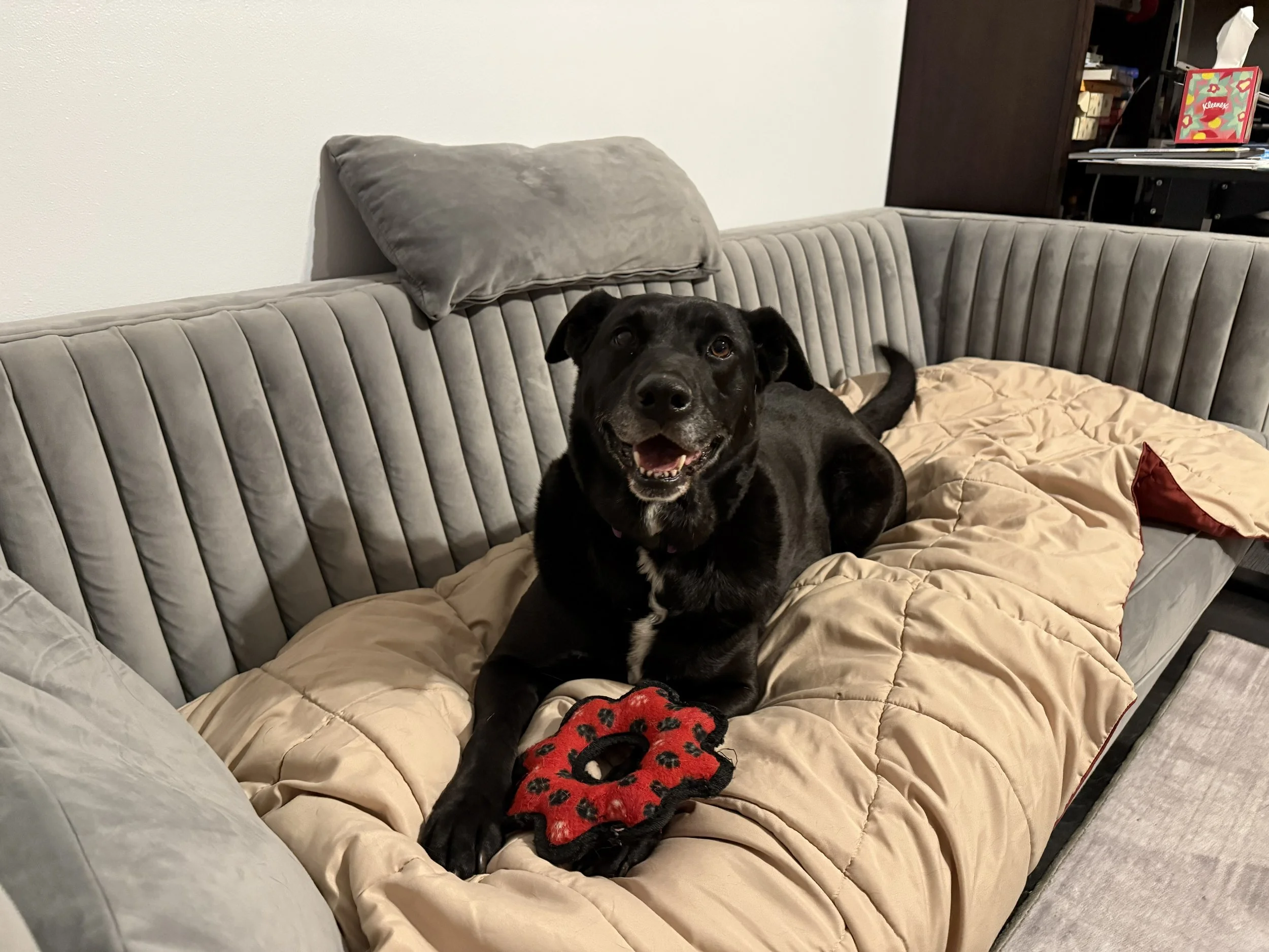 She is, against all Labrador stereotypes, a shockingly picky eater. She’ll keep you humble in the kitchen, but once you discover her preferred menu, she’ll dine like royalty. She has a quiet, observant nature and finds joy in simple routines -- sunny spots, soft beds, and a toy to carry from room to room. But when it's playtime, she'll never admit she's actually a senior gal!