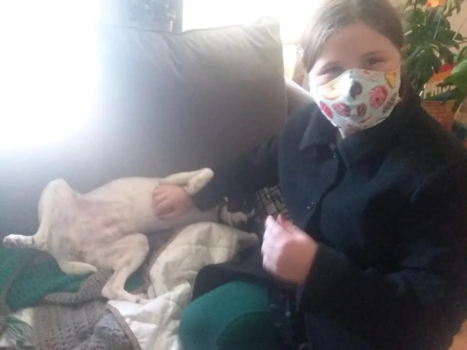Most of the day is spent napping, chewing on a bone or raw hide, and occasionally begging for pets. She's starting to come out of her shell and has shown increased energy, more requests for pets and more people watching out of the living room window, yet naps are still a big part of her day.