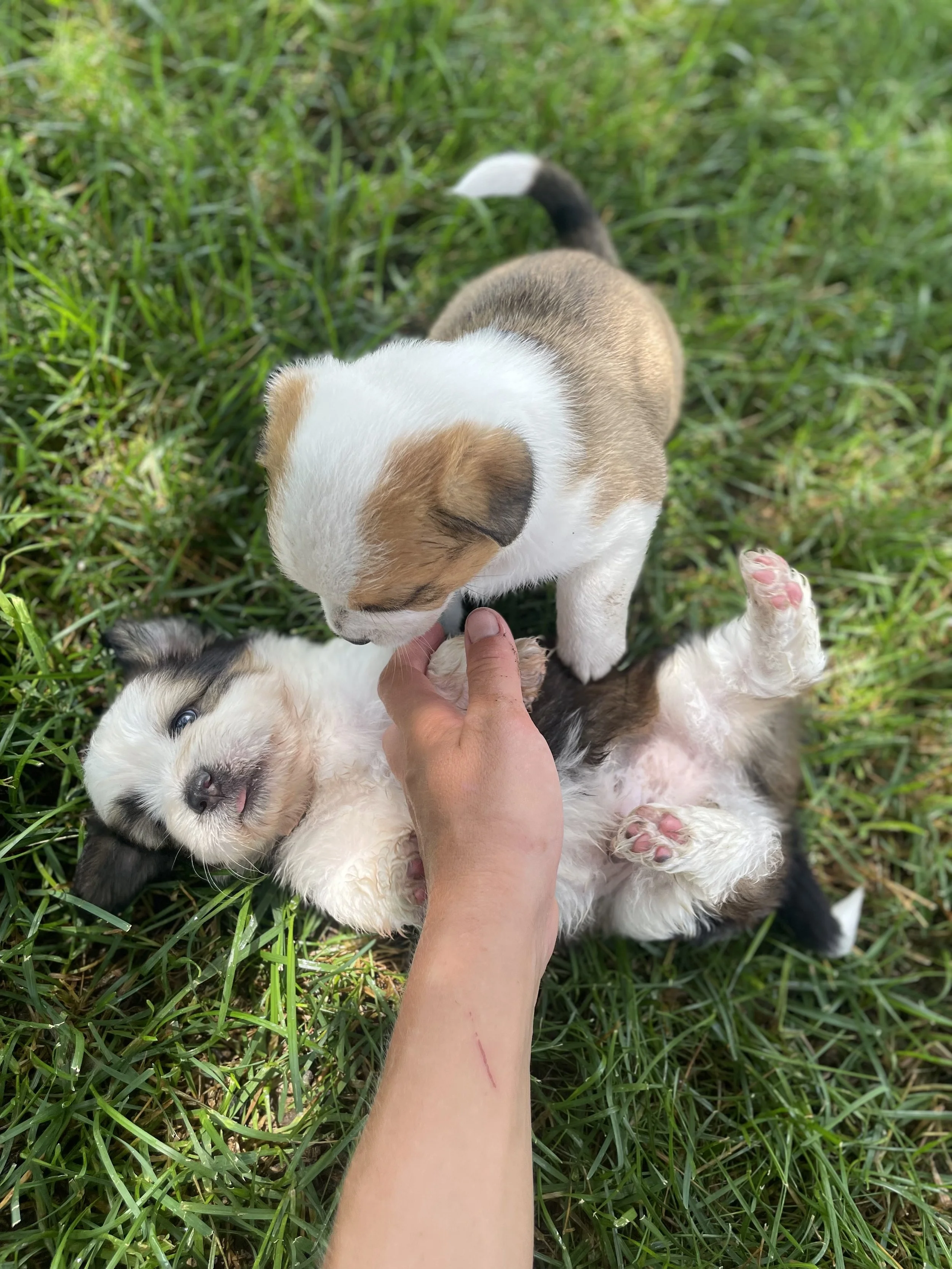 Cassie’s pups were born in foster care on May 19 and will be ready to go home on July 14 at 8 weeks old. They weigh around 3 pounds now. We aren’t sure of breed because mom was a stray, but she is a small fluffy dog who weighs 19 pounds. The puppies are very friendly, social, playful babies who have been socialized with other dogs, cats and kids. Fantasy, Lucky and Hawk look like they will be fluffy, and Art and Midwest have shorter fur.