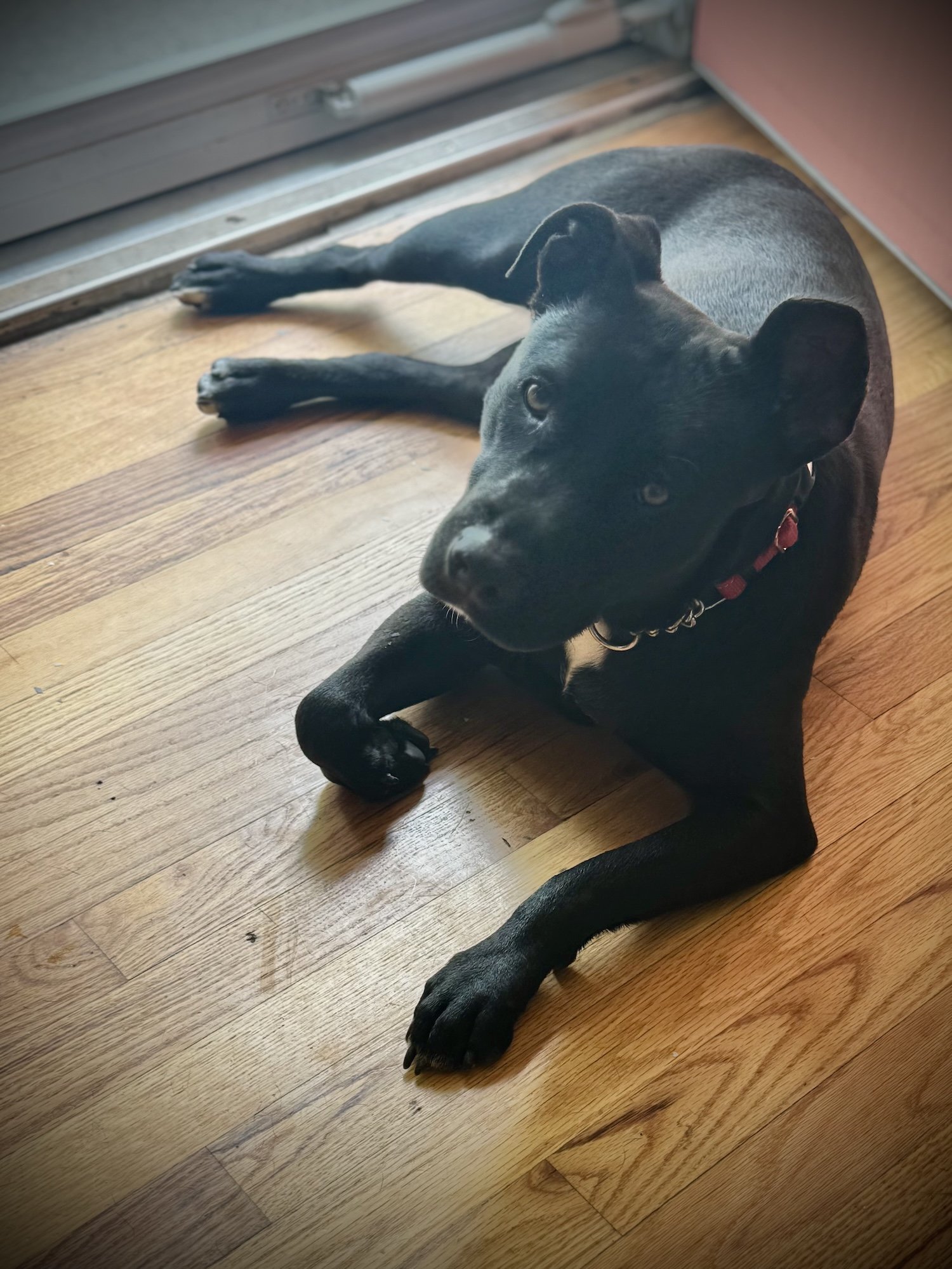 Moon isn’t just her name—it’s her vibe! This out-of-this-world pup shines bright with playful, curious energy that could light up any galaxy (or backyard). She runs around at warp speed during zoomies—faster than a shooting star! But don’t worry, after exploring her universe, she’s more than happy to curl up in your orbit for some serious snuggle time. She is sweet and soft and cuddly.