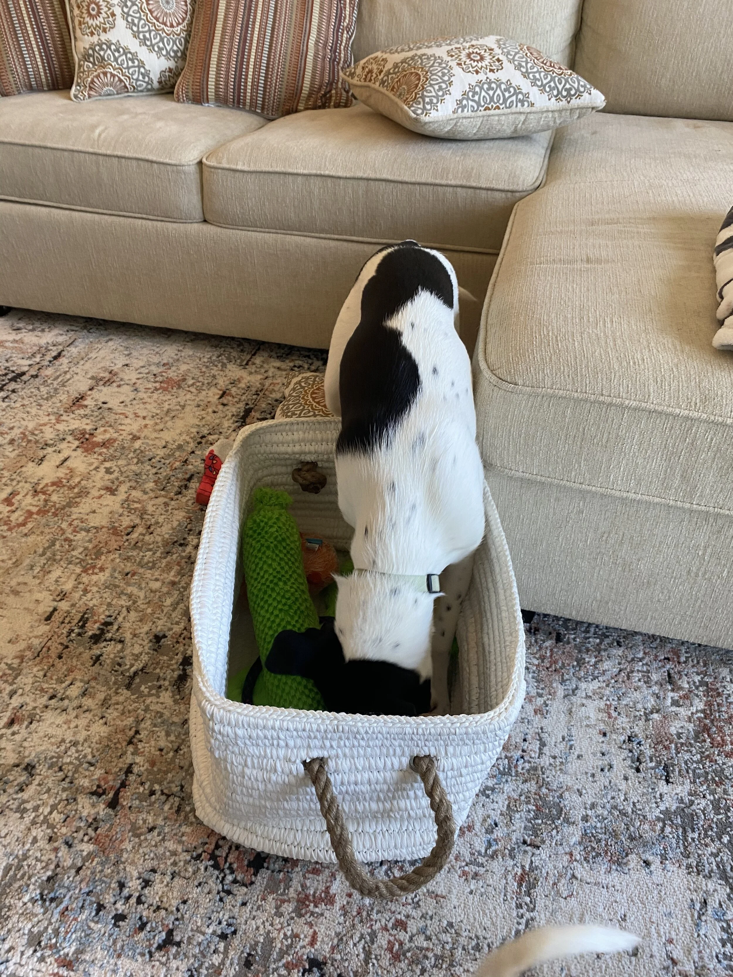 When we leave, she is crated. Mozzarella will cry for a little bit, but she quiets down and sleeps. She has some separation anxiety while alone so adopters will need to continue working on crating. Some nights Mozzarella goes straight to bed while others she takes about a half hour to quiet down.