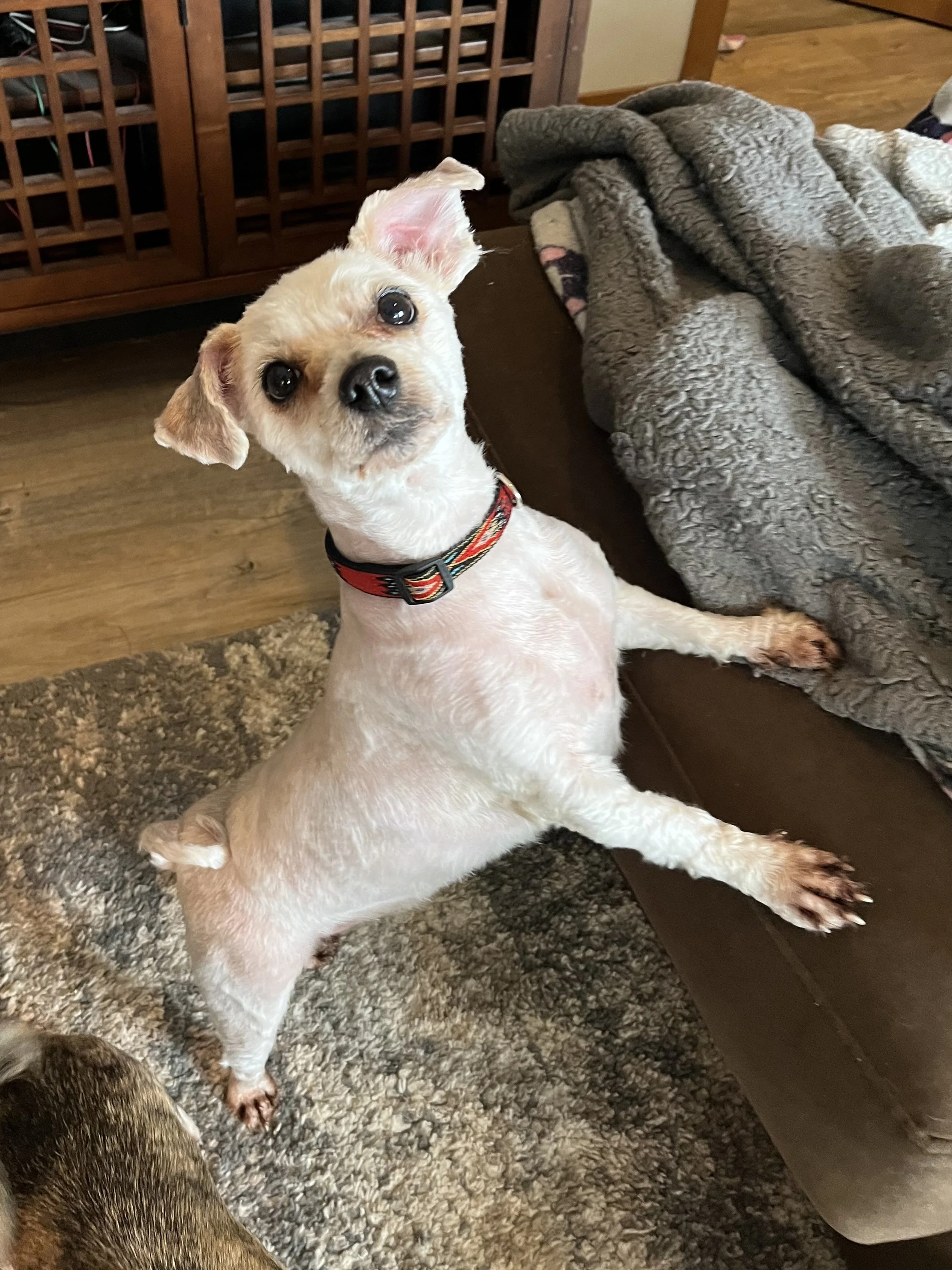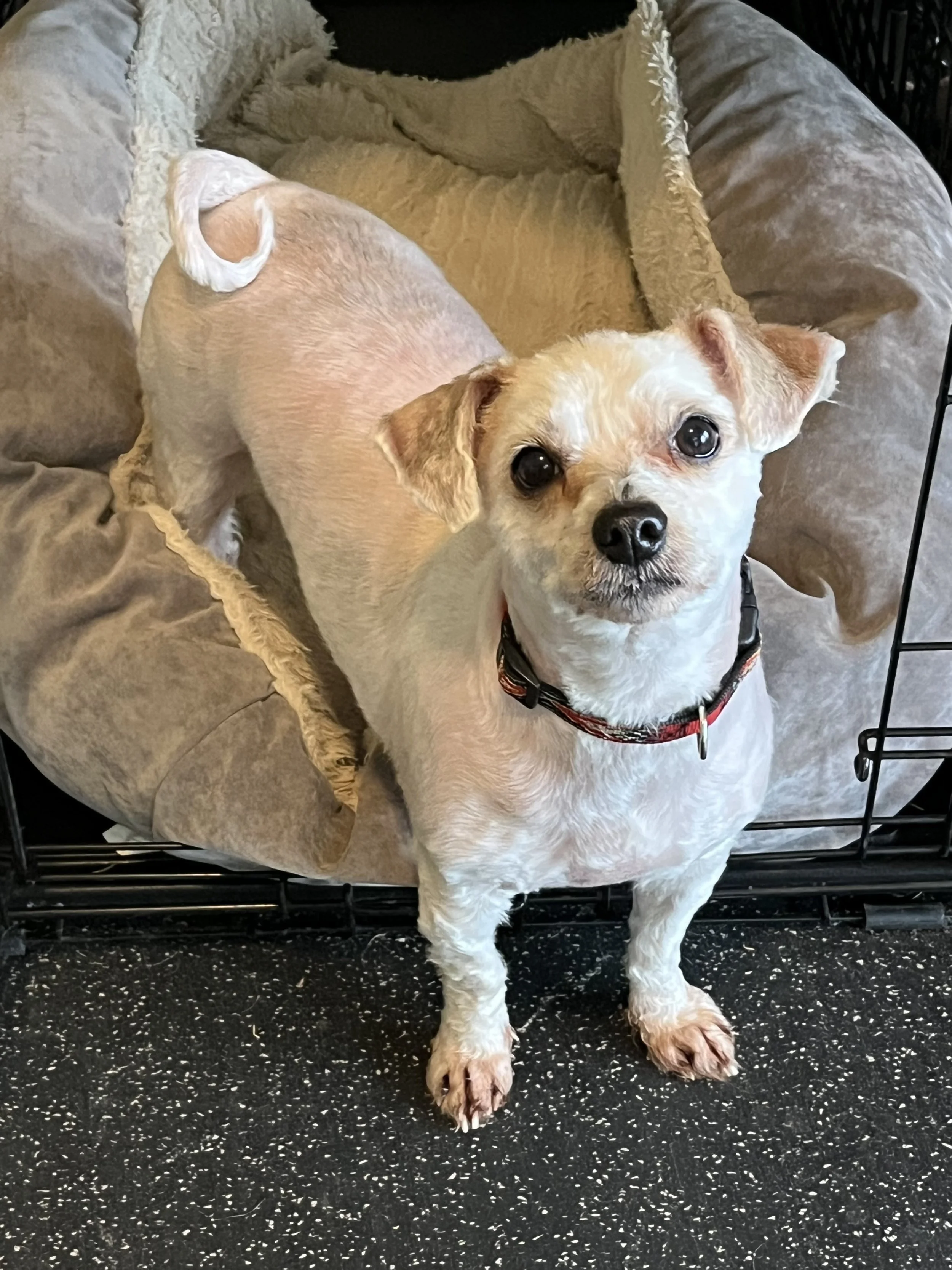 Muppet was picked up in rural Wisconsin after he has been running around loose for months. He was neglected and had become horribly matted. He had to be completely shaved and underneath all that matting was a happy, friendly, bouncy little guy. Muppet looks a little funny now without any hair, but once he grows out he is going to be the cutest little fluffball!