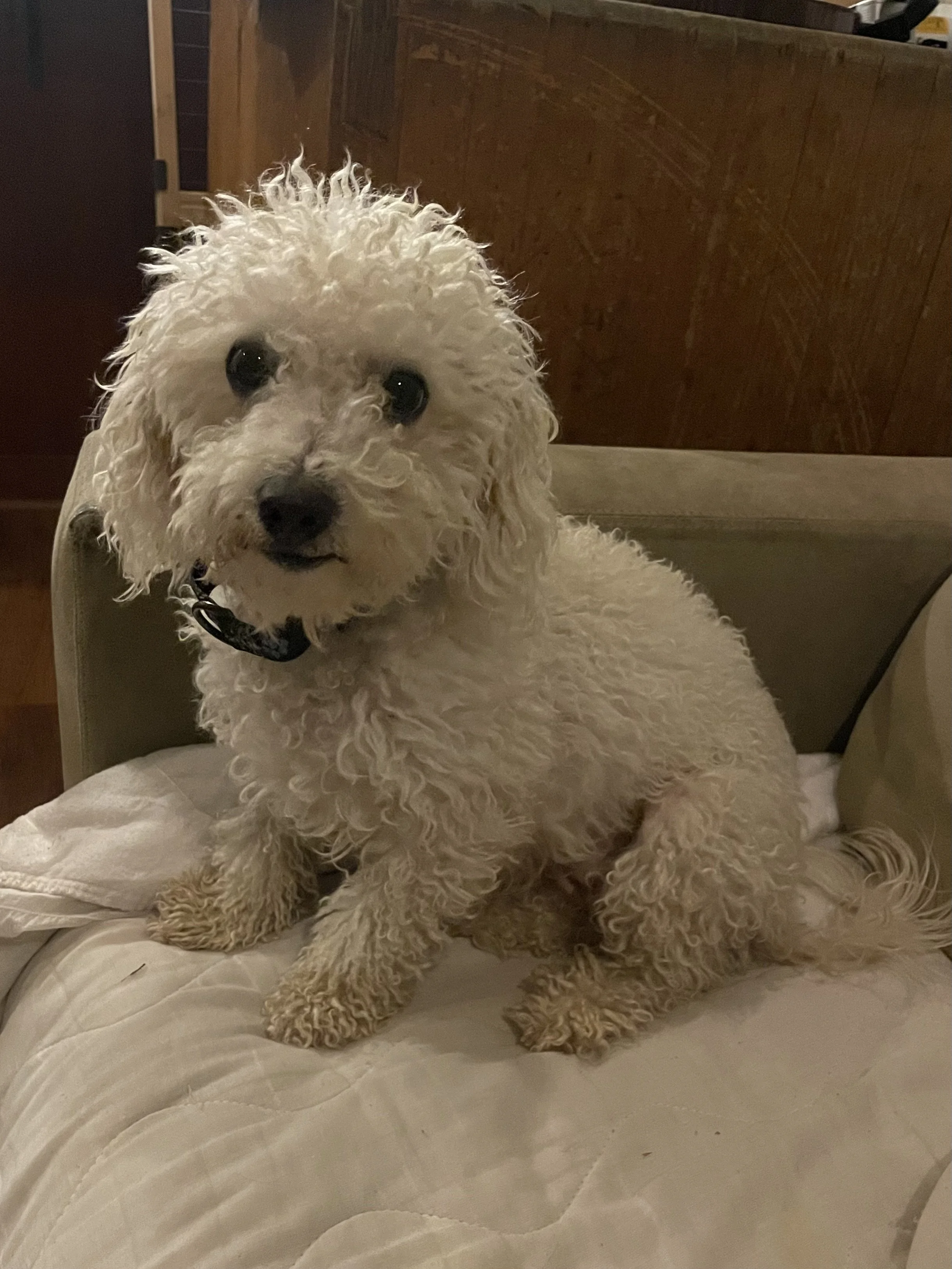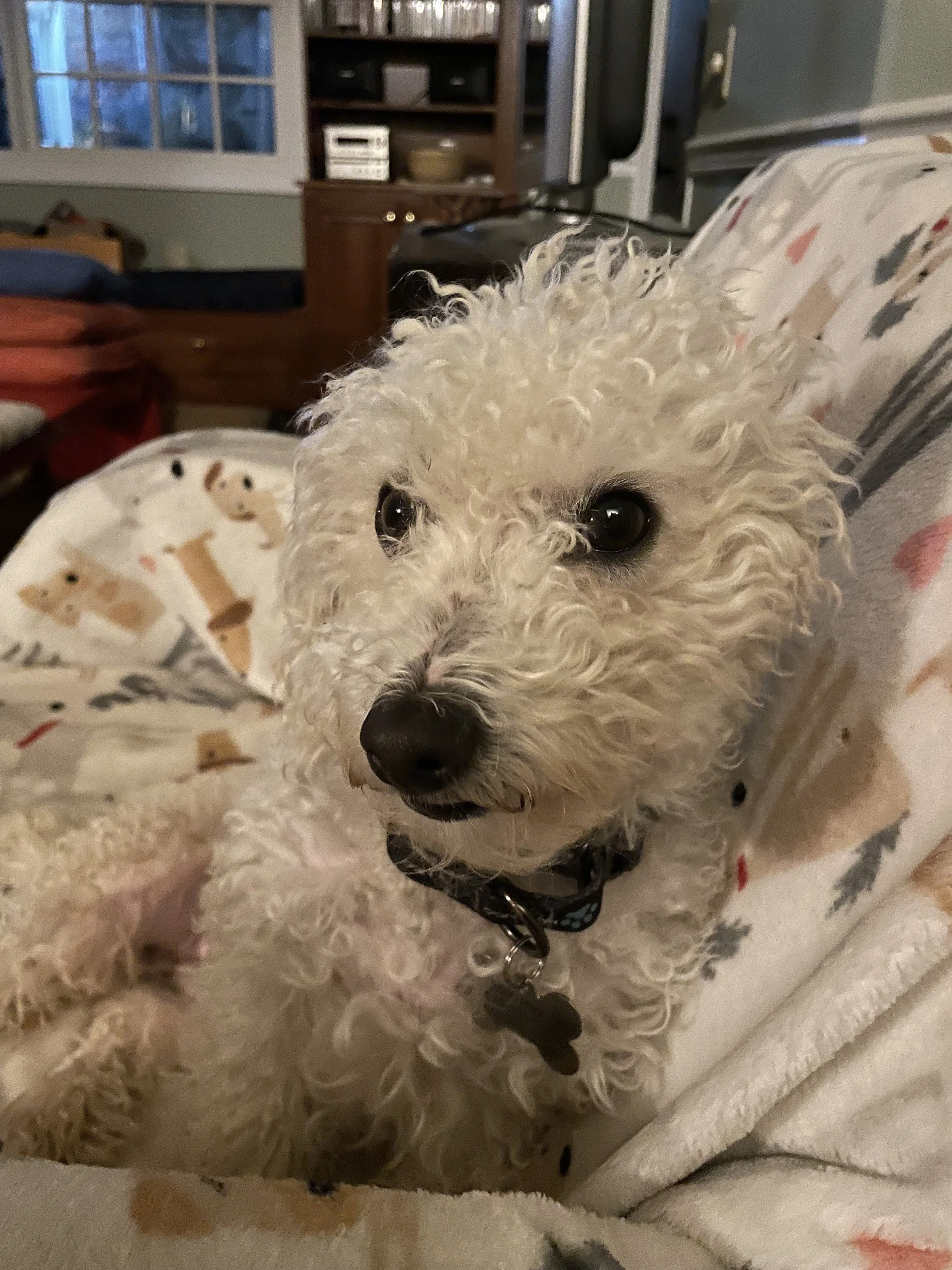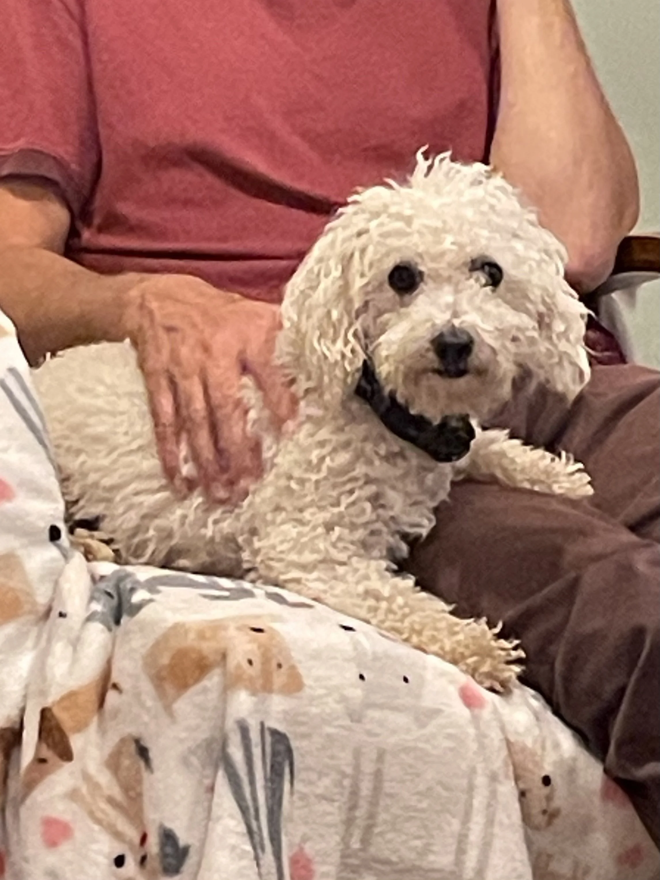 Nelly is a little miniature poodle who came up from Texas where she was surrendered with her two puppies. She sleeps downstairs on her dog bed and is very excited to greet me in the mornings. She stays home by herself during the workdays and is very well behaved and waits politely for her people to return. In the evenings she wants to be by your side or on your lap and she will follow you everywhere. She loves to cuddle and she will nudge you with her nose or paw if you think you are done petting her.