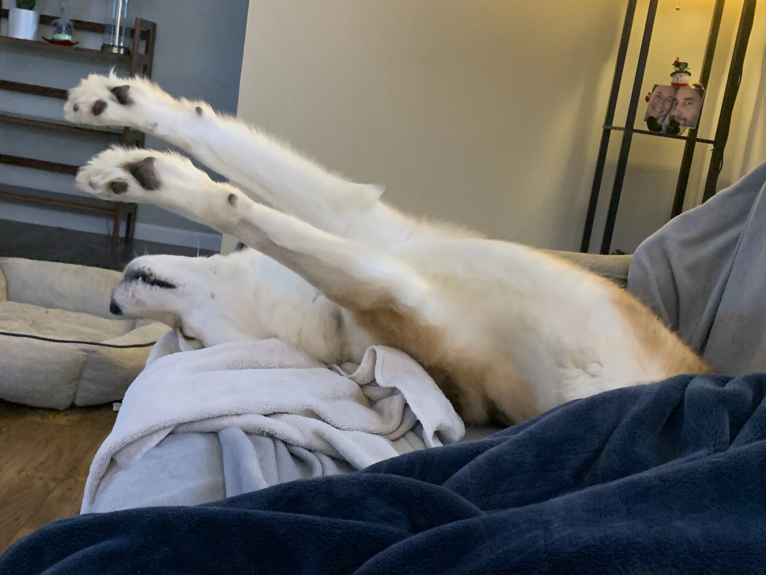 We get up around 7:00 am and Otis and my resident dog go outside for a potty break. Then he gets breakfast and if I go to work, he goes in the crate with a Kong treat and toys and naps the day away until I return in the evening. Then I let him out for a potty break and to play before coming inside to eat dinner. Then we play some more or go for a walk before resting for the night. If I am working from home or it’s a weekend, he tends to just nap on the couch or lay outside the door of the cat’s room hoping to sneak a peek. I let him out to go potty every so often and we’ll play outside in the snow or go on a walk during the day. He likes to chase after a ball but isn’t good about returning it.