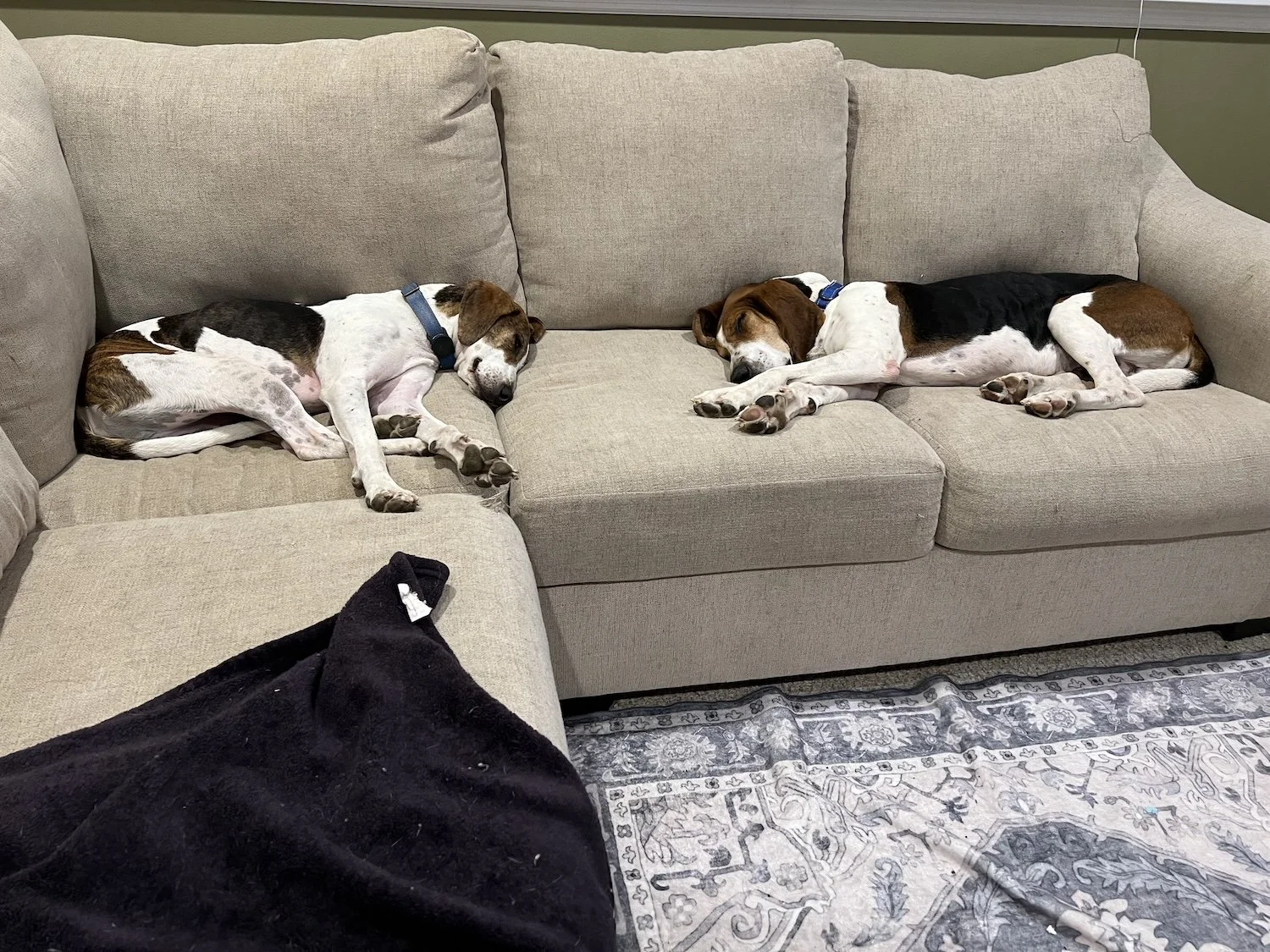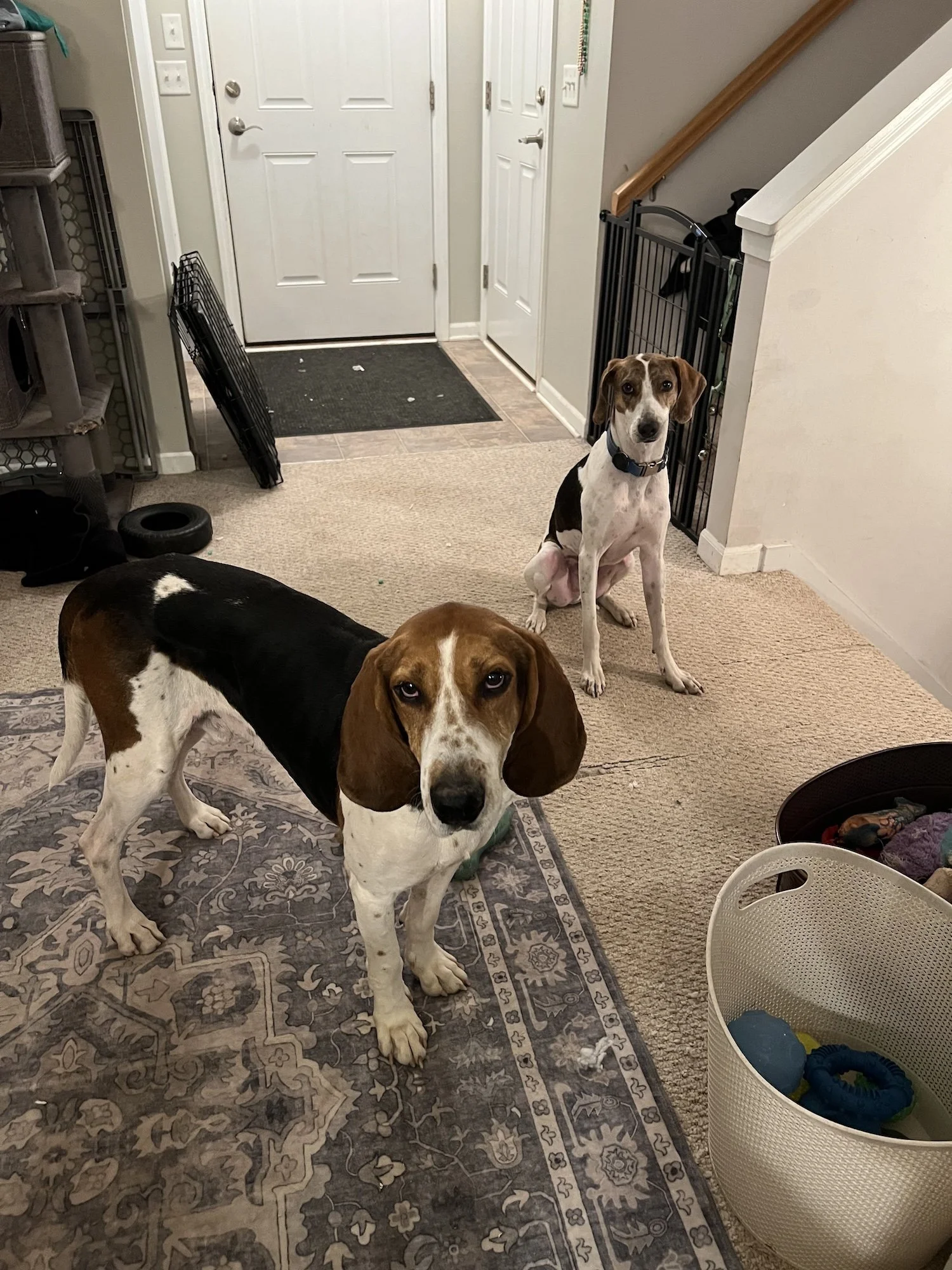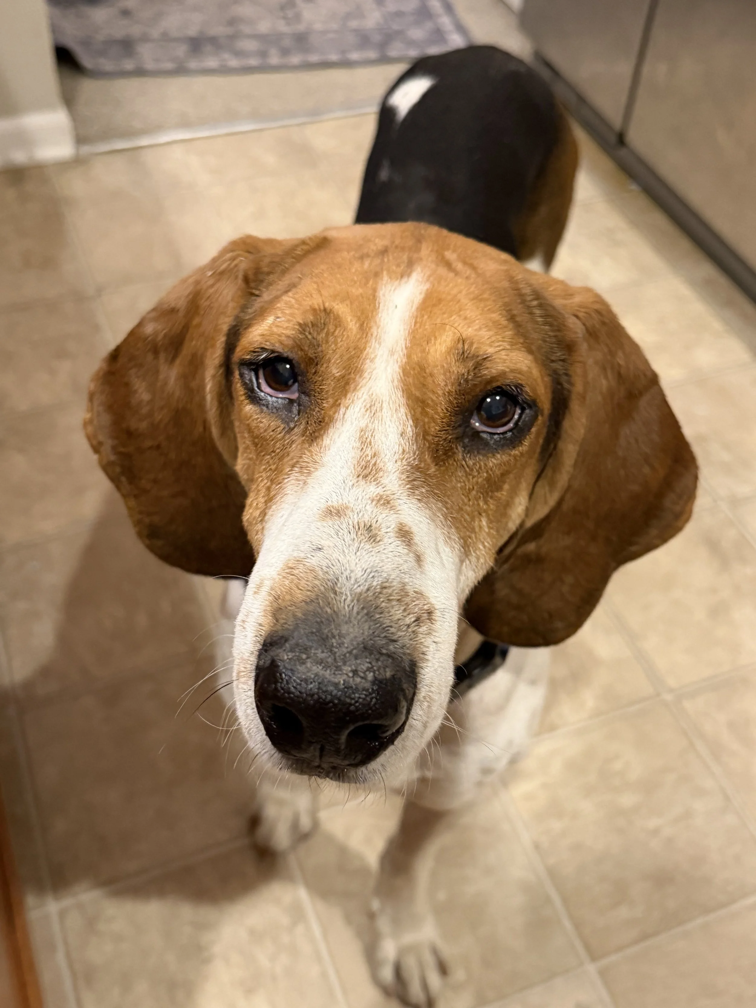 Rex just got to Wisconsin and was getting used to his change of environment. He’s now fully himself and doesn’t seem depressed anymore. He walks well on a leash. Because he’s a hound he has quite the nose which lends him to counter surfing. He does respond to a leave it command.
