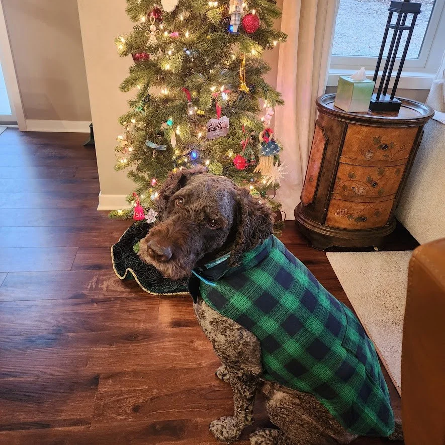 Riley is an 8-year-old, 90-pound labradoodle who is a gentle giant and an easy-going dog. He has passed 3 obedience training classes and can do all the basic commands, but he will only obey if a treat is involved! Honestly, he will do anything for a treat. He has full range of the house when we are gone and does not chew or tear things. He usually lays around during the day, on his dog bed, the couch, or a chair. He has never been interested in dog toys, but he will play fetch if treats are offered.
