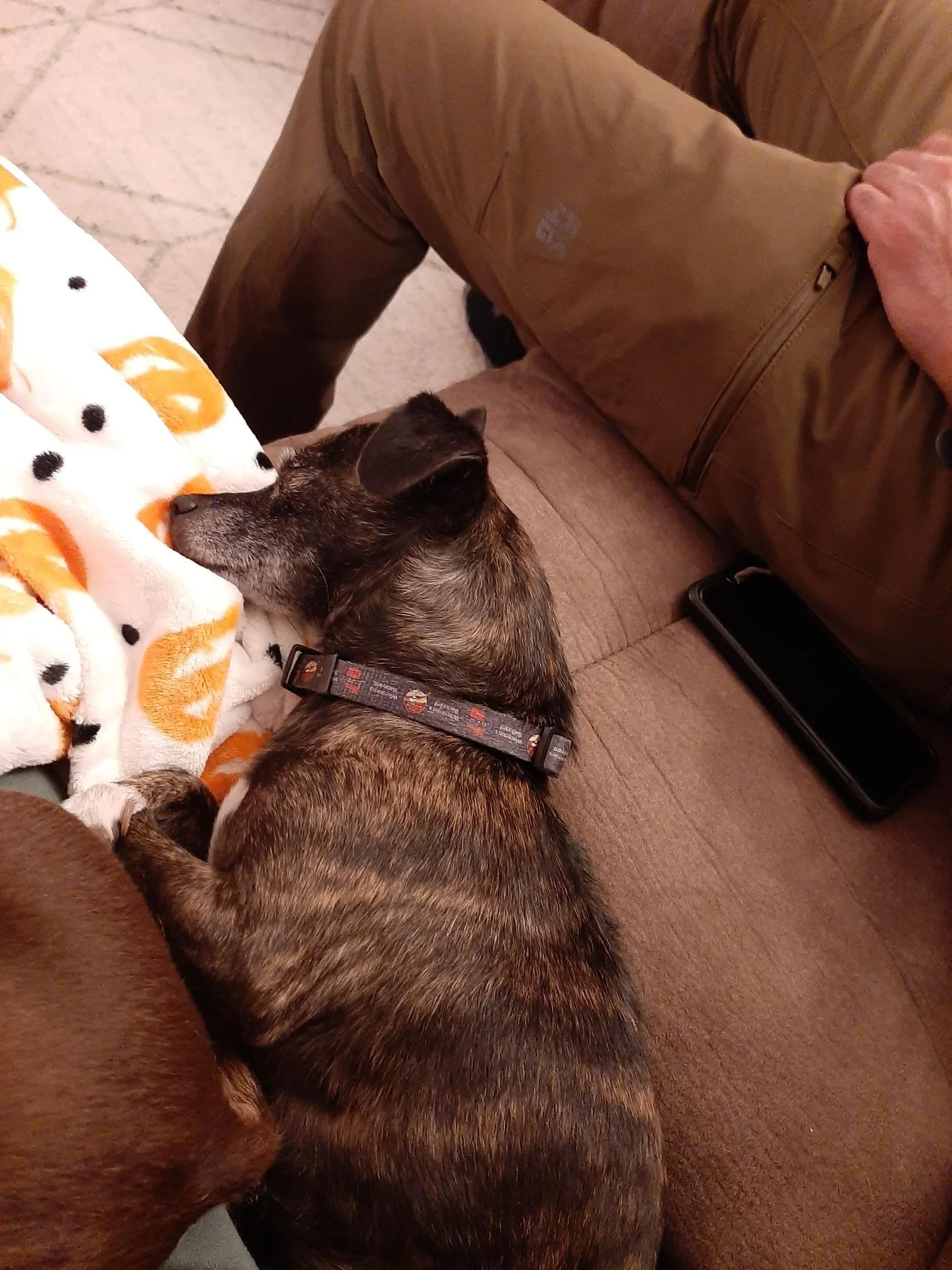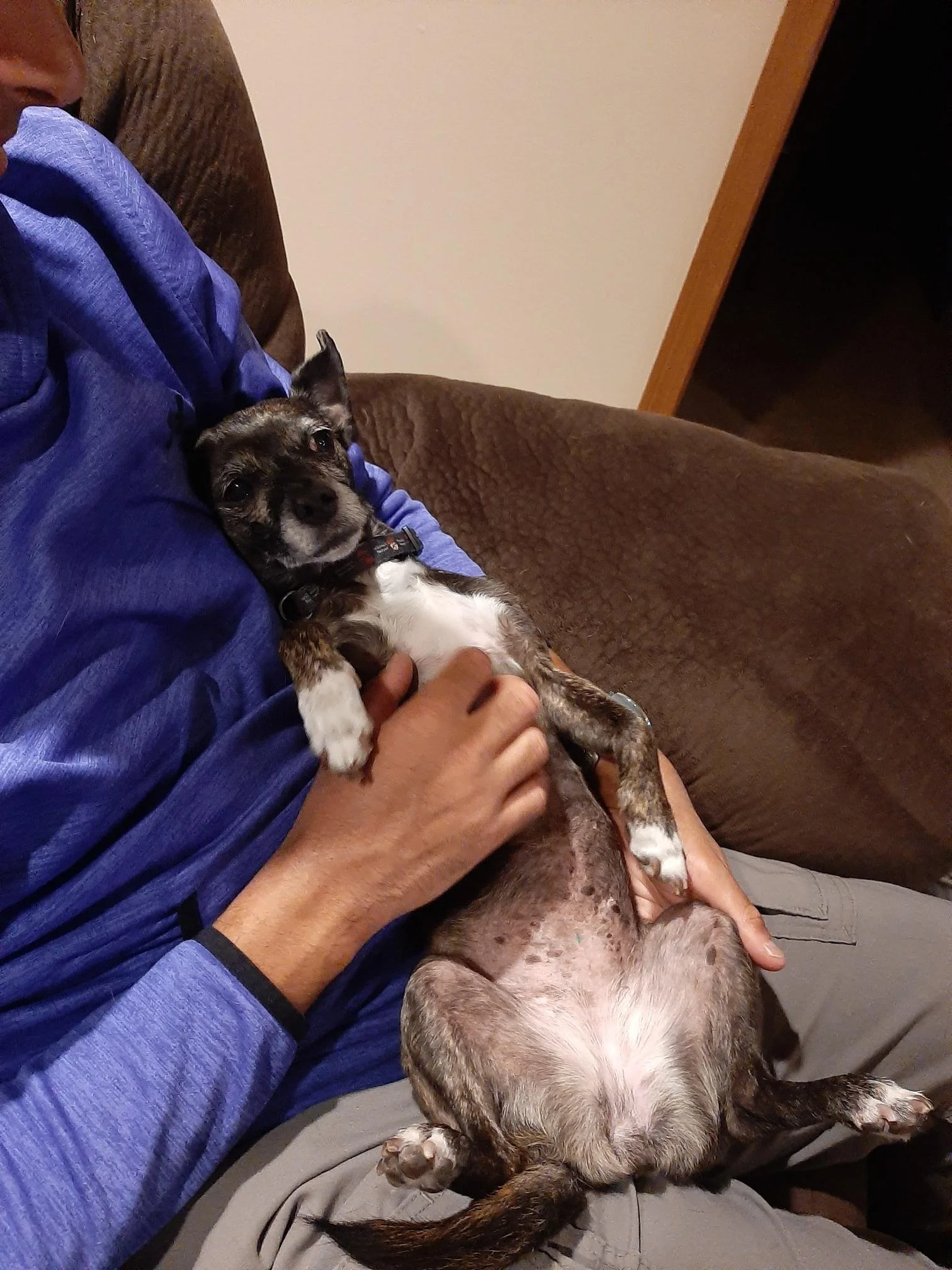 River is fully potty trained and very polite. She’ll sit nicely for treats or when you’re clipping on her harness. She’s also a great little adventurer—despite her size, she happily kept pace with a lab mix on a 3-mile hike! She loves walking and would thrive with someone who can give her at least one good daily stroll. One quirk to know: if you linger too long picking up her poop, she may try to slip out of her harness. A snug, well-fitting harness or martingale collar is recommended for this little Houdini.