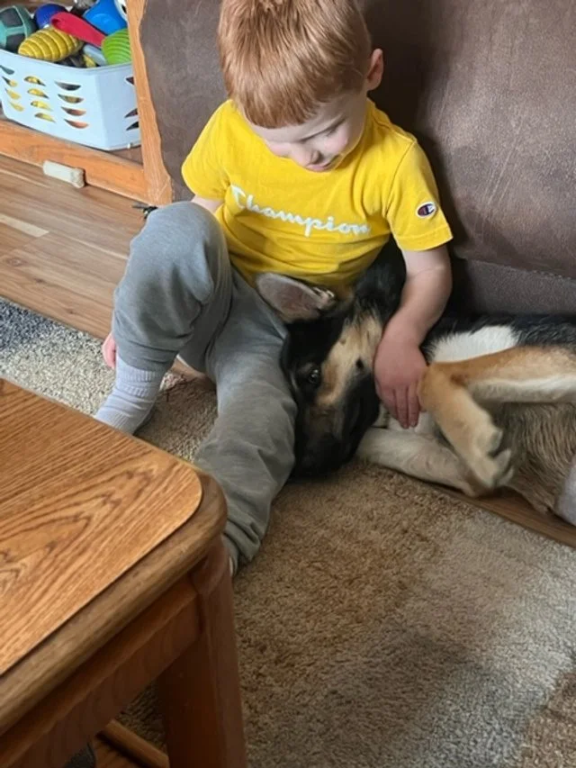 River is fantastic with kids. She loves my 5-year-old grandson. She plays with him and snuggles with him. River is respectful with toys and takes all treats VERY gently. My grandson notes she loves belly rubs and a good neck scratch!