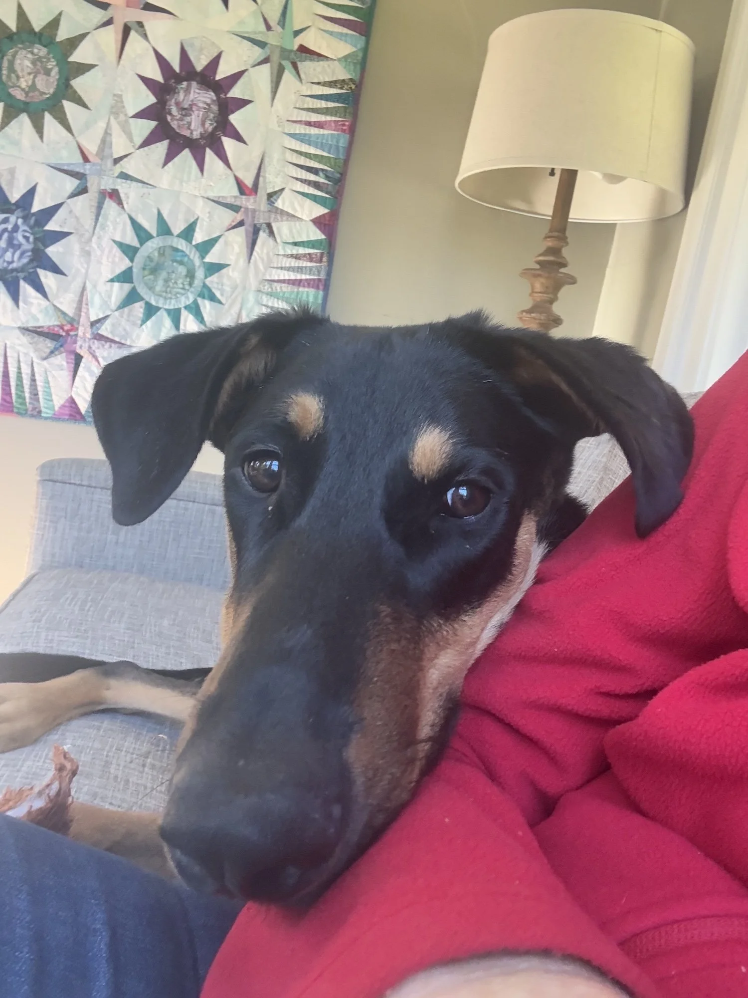 Meet Rocky- he’s a lover! Rocky may have Doberman in his lineage but he’s all heart and no fight. This guy is a big, cuddly, love bug. Rocky has mastered the doberman lean; he will slide up along side of me and stop with his head precisely under my hand and “lean in” for love and pets. He likes to be close and in contact whenever possible. This guy might not be lap dog size but that does not stop him from attempting to occupy your lap- even if only his head fits!