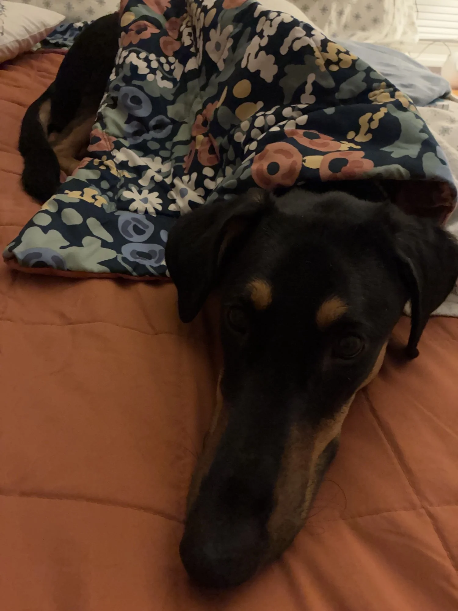 QUICK FACTS: 🐕Dog friendly 🤔Unknown with cats 🤔Unknown with kids 💤Crate trained 🐕🦺Walks well on leash 🚗Good in the car 🧸Loves to play 🥰Snuggle Pup 😀Friendly