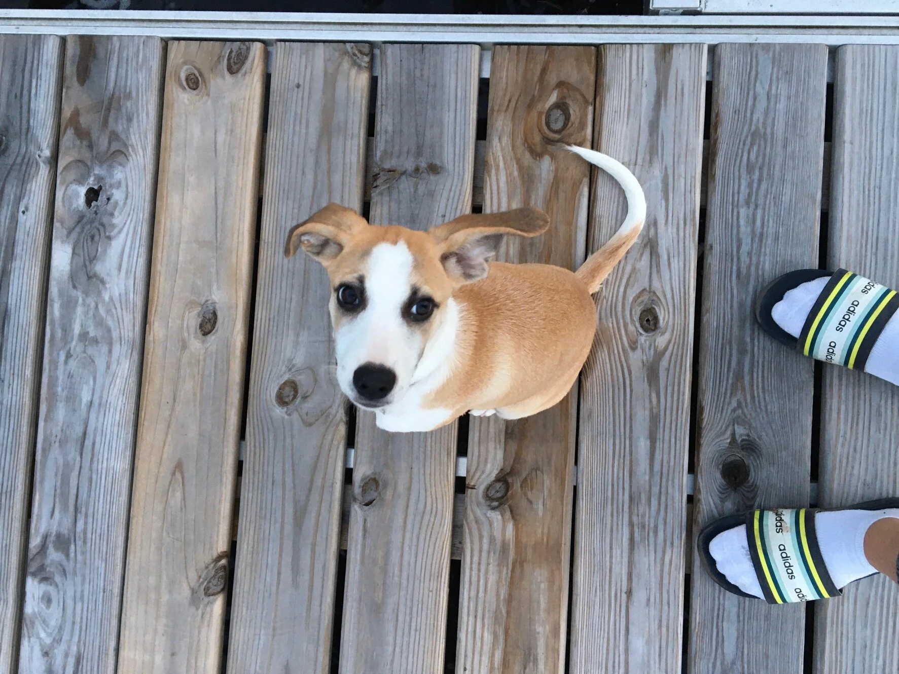 She loves to be with us! She whined a bit when we first brought her home but is now more comfortable and confident. She follows us and is just a really happy puppy.