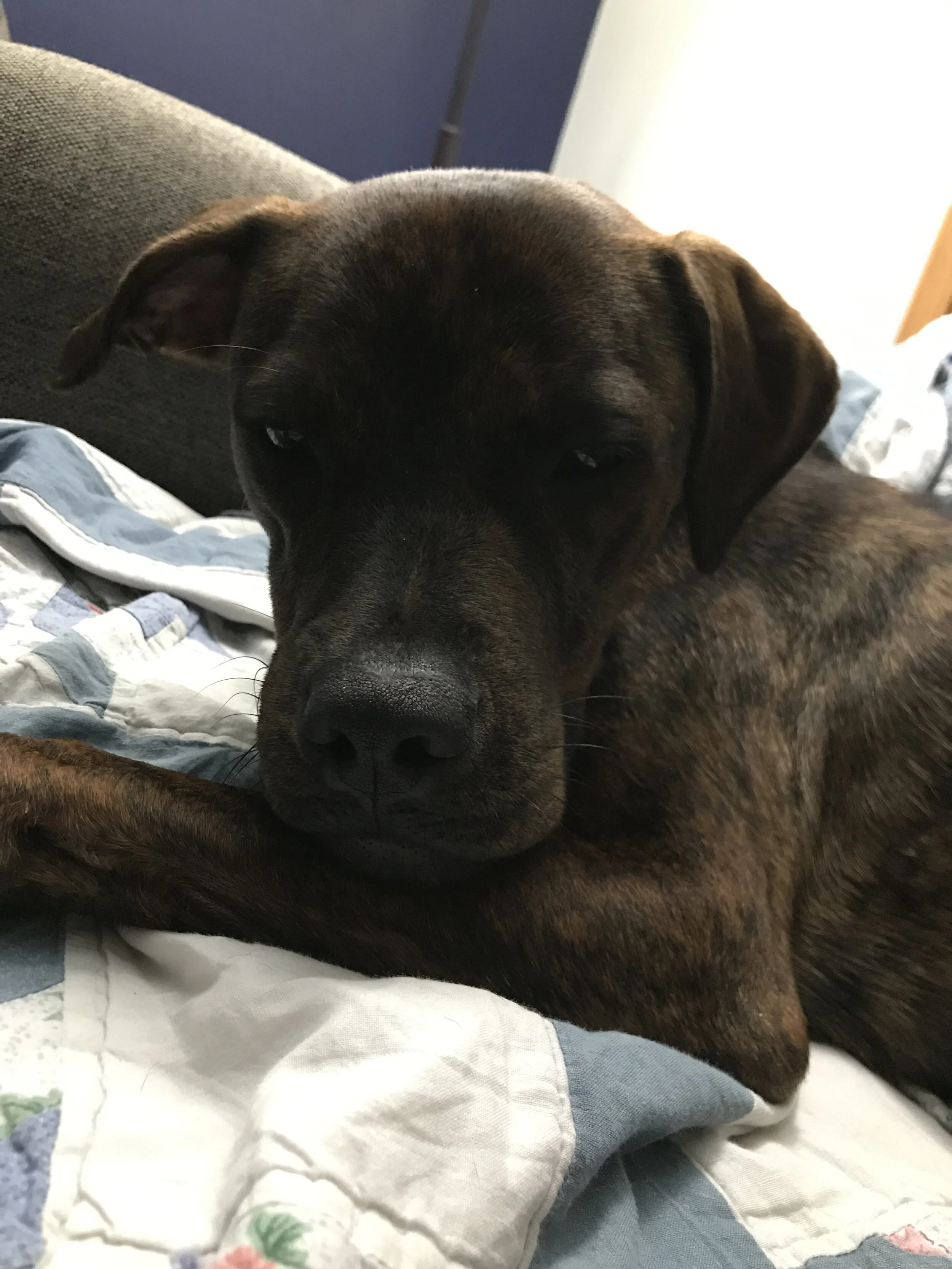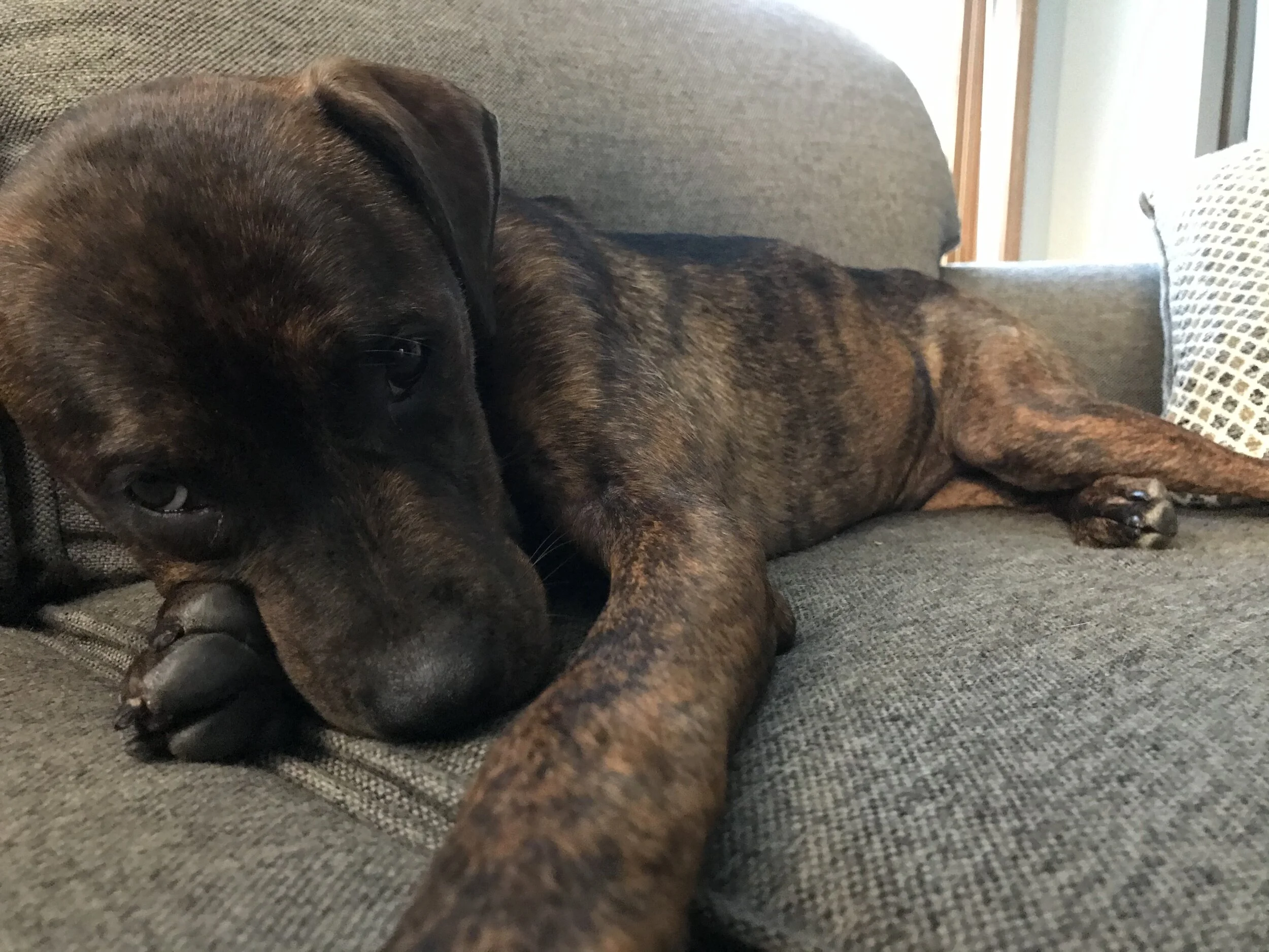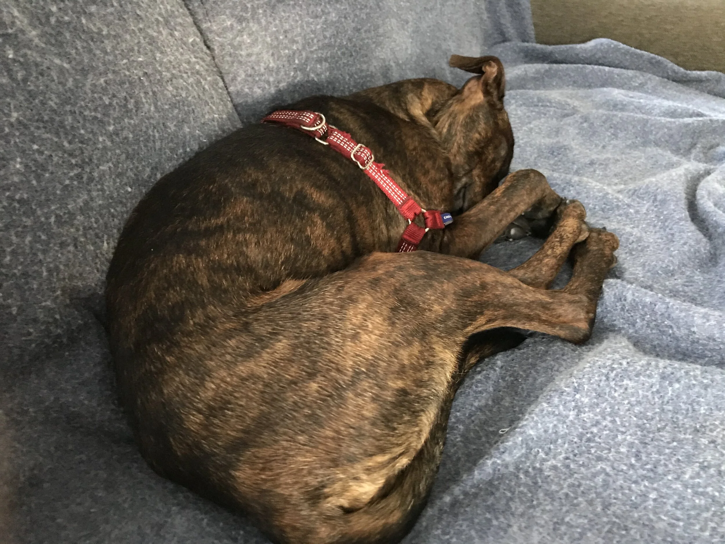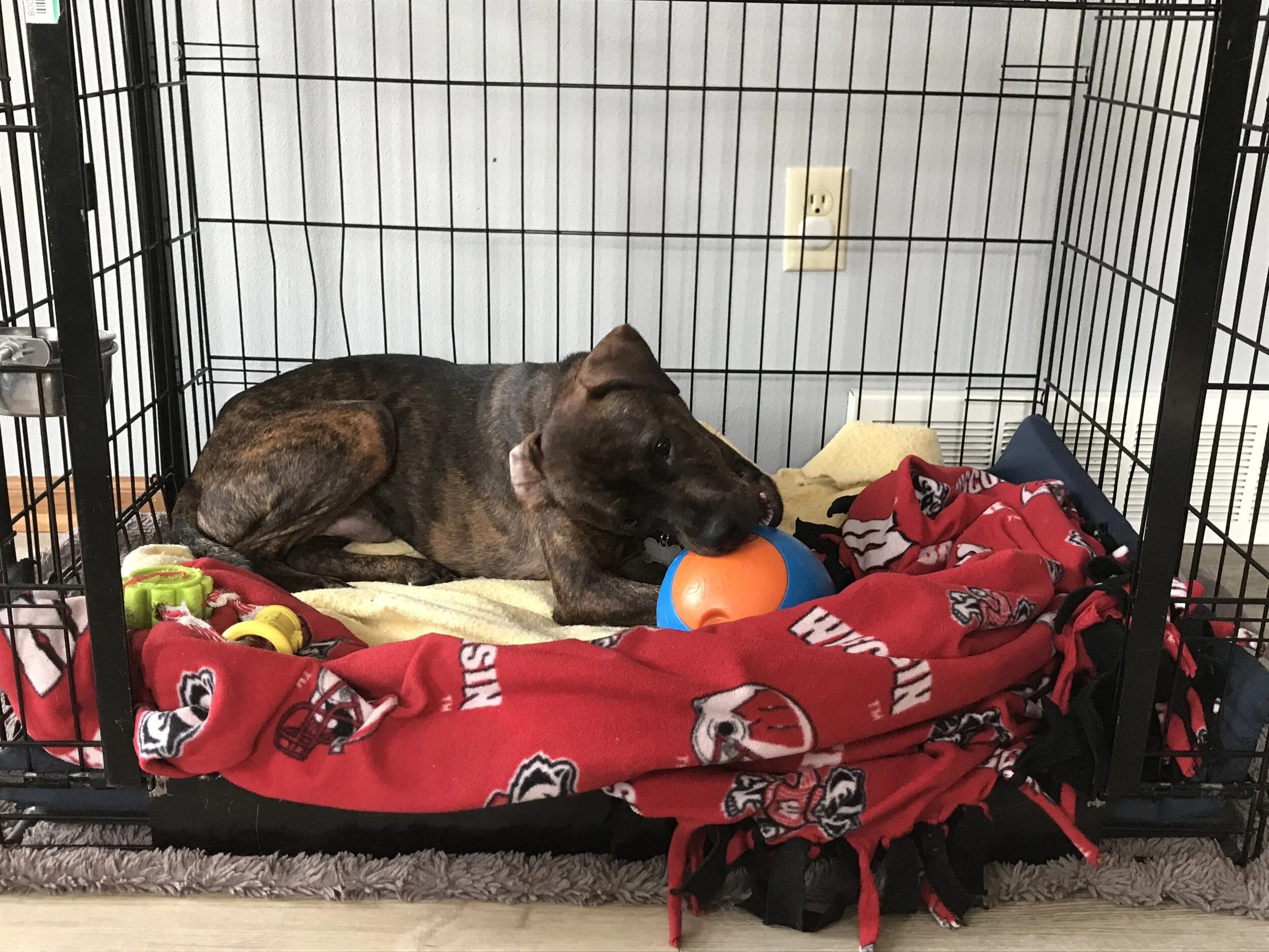 After a good play session in the morning, Spark goes down for a nap on the couch or in his crate. He is let out several times during the work day. His foster parents work from home but do crate him occasionally for a few hours at a time. He is happy with a good few toys Kong treat toy and a soft blanket in his kennel. He doesn’t make a peep in the kennel during the day. There is some minor whining when first going in the crate for bedtime but he quiets down after a few minutes.