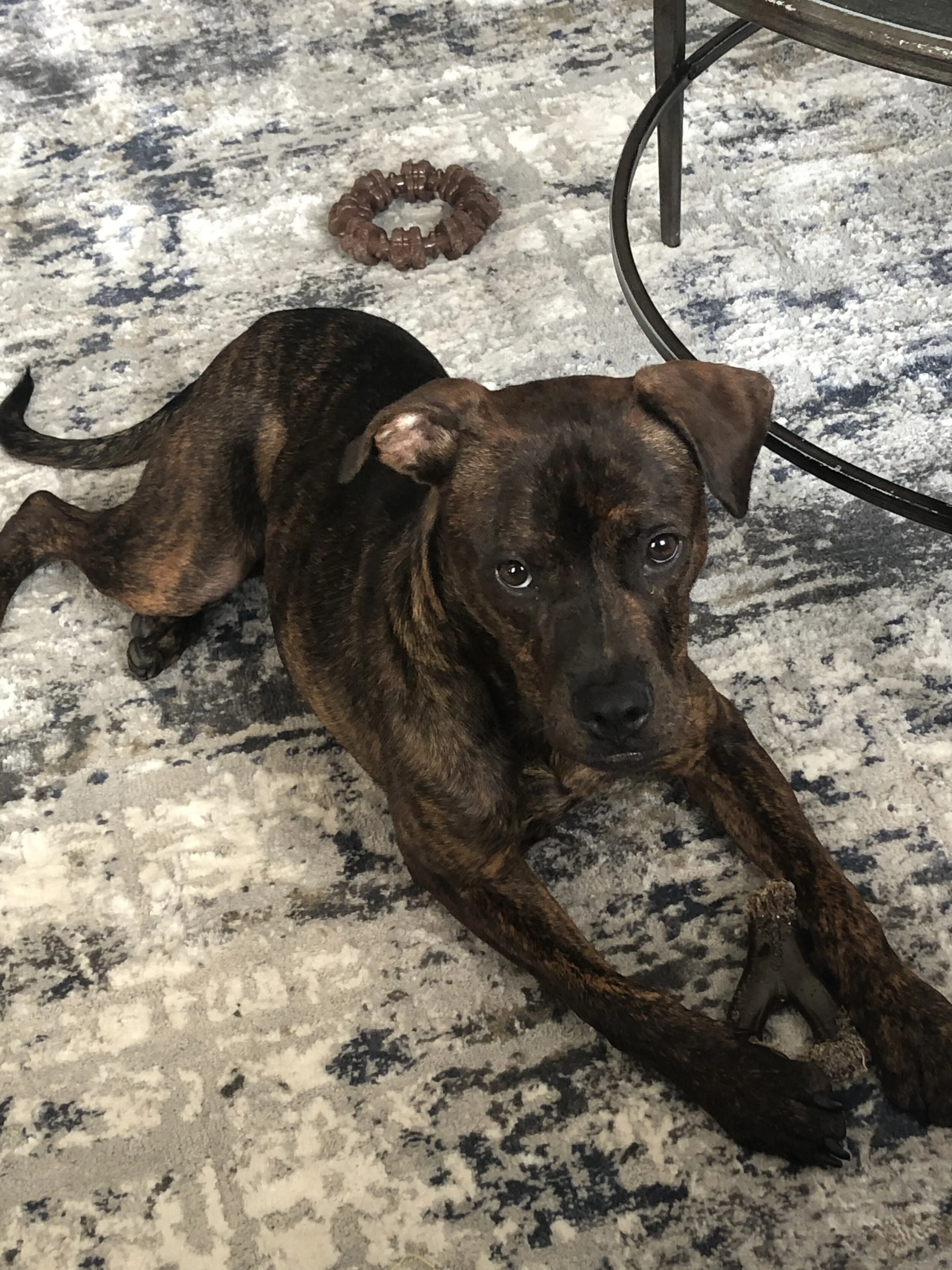 He lives with an older resident dog who will play a few minutes per day but not for hours. It’s helpful that Spark can entertain himself with toys. He takes each toy out of the box and one of his favorites is a Nylabone chew toy. Spark would do well in a home with another energetic dog or as an only dog with daily walks and stimulation.