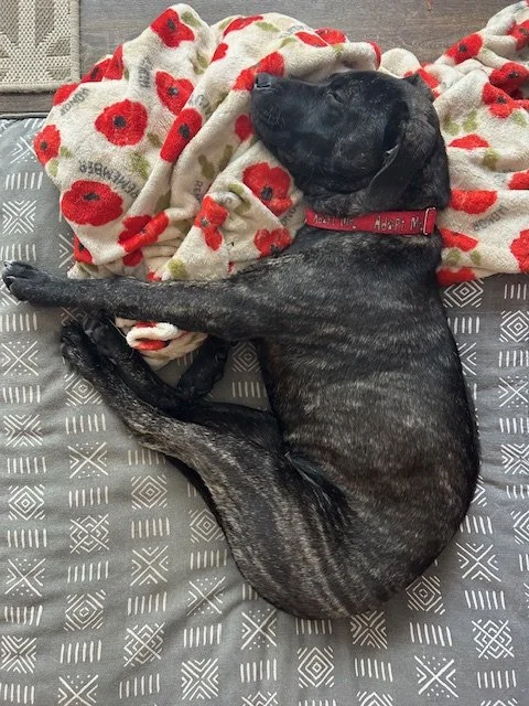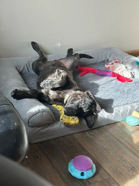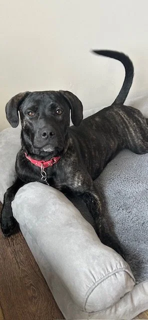 Stan is a fun pup to have around. His stout shape and beautiful brindle coat garner him lots of attention. Luckily, Stan likes to be the star of the show and happily accepts the attention. I sometimes call him “Stan the ham”! He is young so he still has lots of puppy joy to share with the world. We go on 1-2 walks a day and he enjoys playful bursts with my resident dog which helps him get through our workday. He has also been attending doggie day care and absolutely loving it. Upon his arrival the staff always say “STAAAAAN” and he trots over for hugs before the real play time begins. No matter what his day looks like he settles in during the evening either on the couch for snuggles, or in his dog bed where he snoozes until we all go to bed. He sleeps through the night from about 10pm-6am.