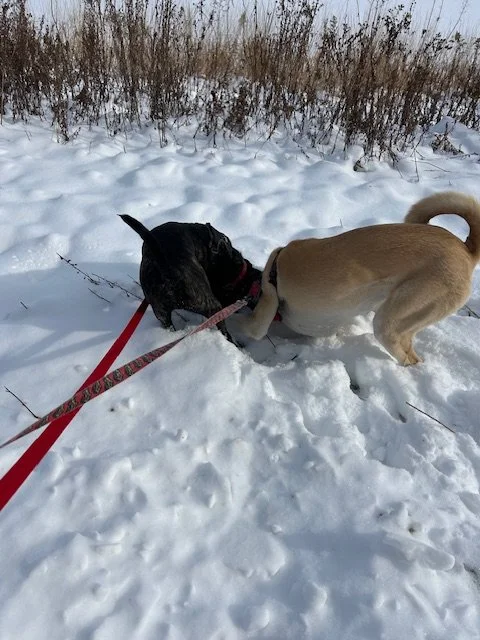 Stan hails from a rural area down south where he lived outside so all the city noises and “rules” of living in a house were new to Stan. He was initially a bit nervous, but quickly adjusted to a life of luxury and now rather enjoys exploring his new neighborhood on our walks. In spite of his southern heritage the snow is no match for Stan. He will still happily play outside and stick his whole head in the snow if he suspects there is something cool below. Stan loves to sniff around on our walks so we balance time for him to sniff with practicing walking well on a leash.