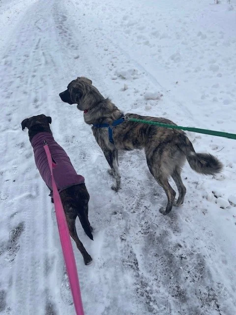 She's overall very good with leash walking and has quickly gotten the hang of stopping at intersections and sitting until we're ready to cross. Needs to continue working on this though as she will get stubborn and sit/pull back a times when she doesn't feel like moving or conversely pull forward for small critters she wants to meet (at >50lbs she can pull pretty well!).