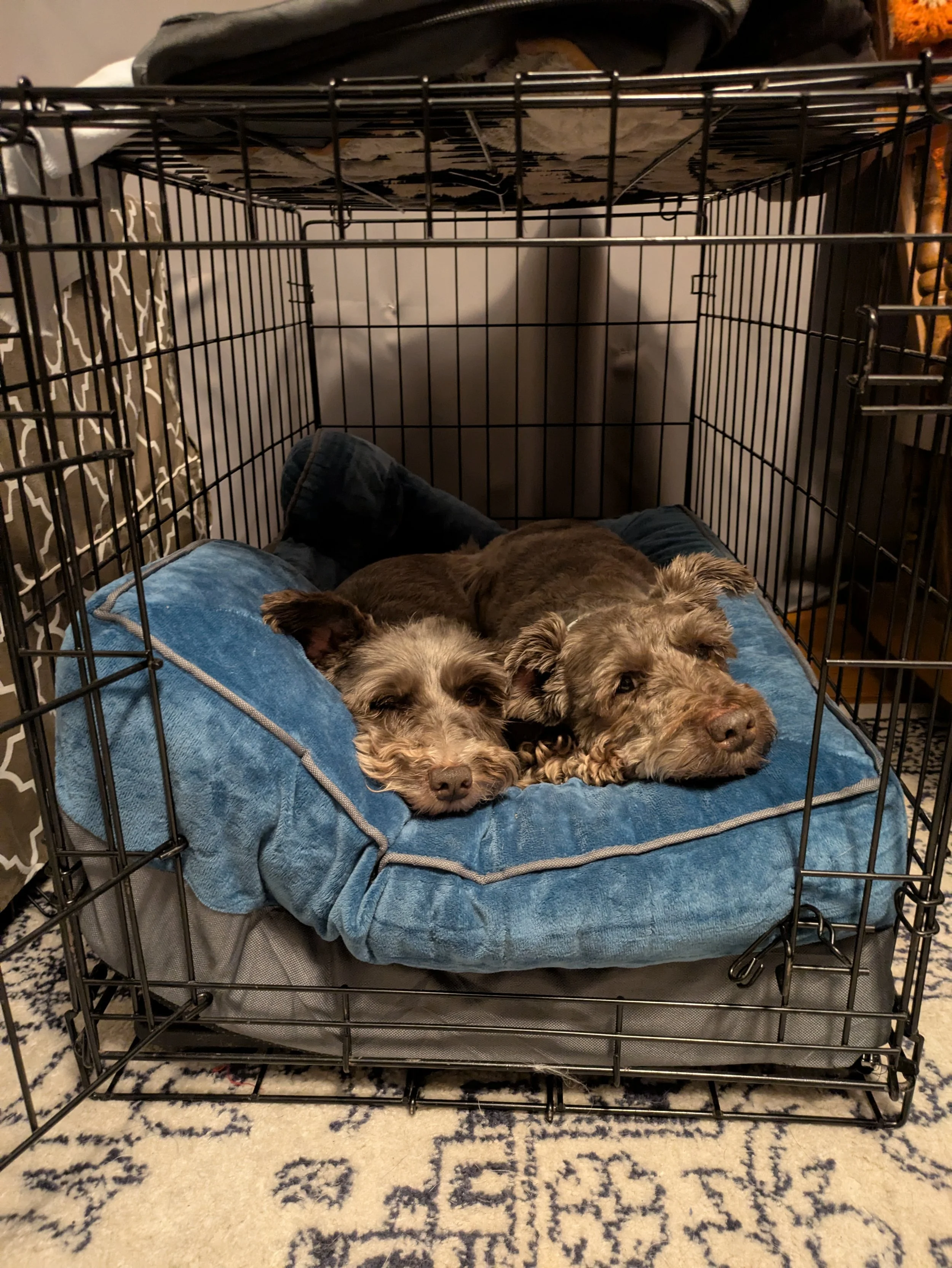 Teddy and Mousse both sleep in their crates at night, and when their foster parents are away from home. They would also happily share your bed with you at night if you are willing. We have found that they like their crates to be right next to each other so they can see each other, but they both happily go into their crates when asked. Both consider their crates their safe space, and we will often find them snoozing in their crates with the door open when we are home.