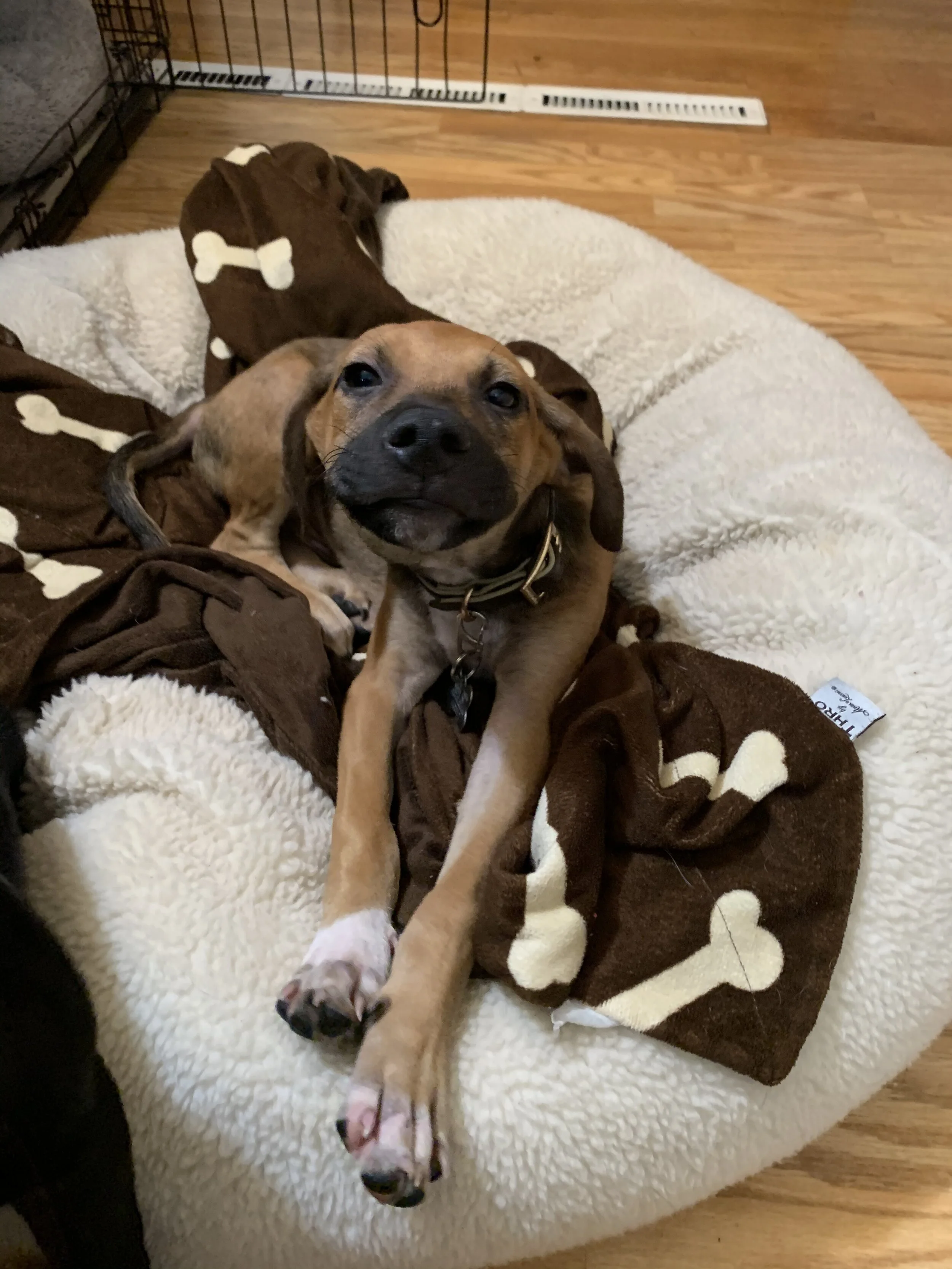 Walnut is a typical puppy. He likes to play hard with his foster brothers, but he also crashes hard for naps. Walnut has a big backyard to play in, but he often doesn't run as much as wrestle and tug with other dogs to get his exercise. He loves to play with humans in the house too. Since Walnut is so young, he doesn't have a lot of practice on a leash. This is something he will need some training on as he gets older!